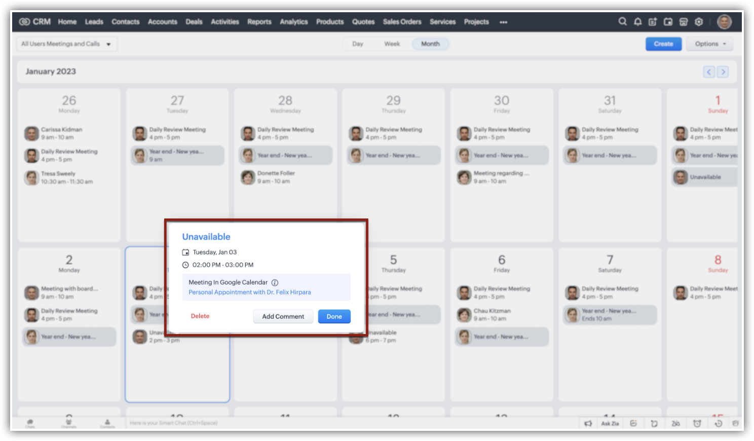 - Când ștergi un interval indisponibil din calendarul Zoho CRM după ce a fost sincronizat din Google Calendar, acesta va fi eliminat doar din CRM, iar evenimentul original din Google nu va fi afectat.
