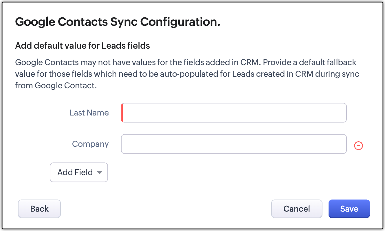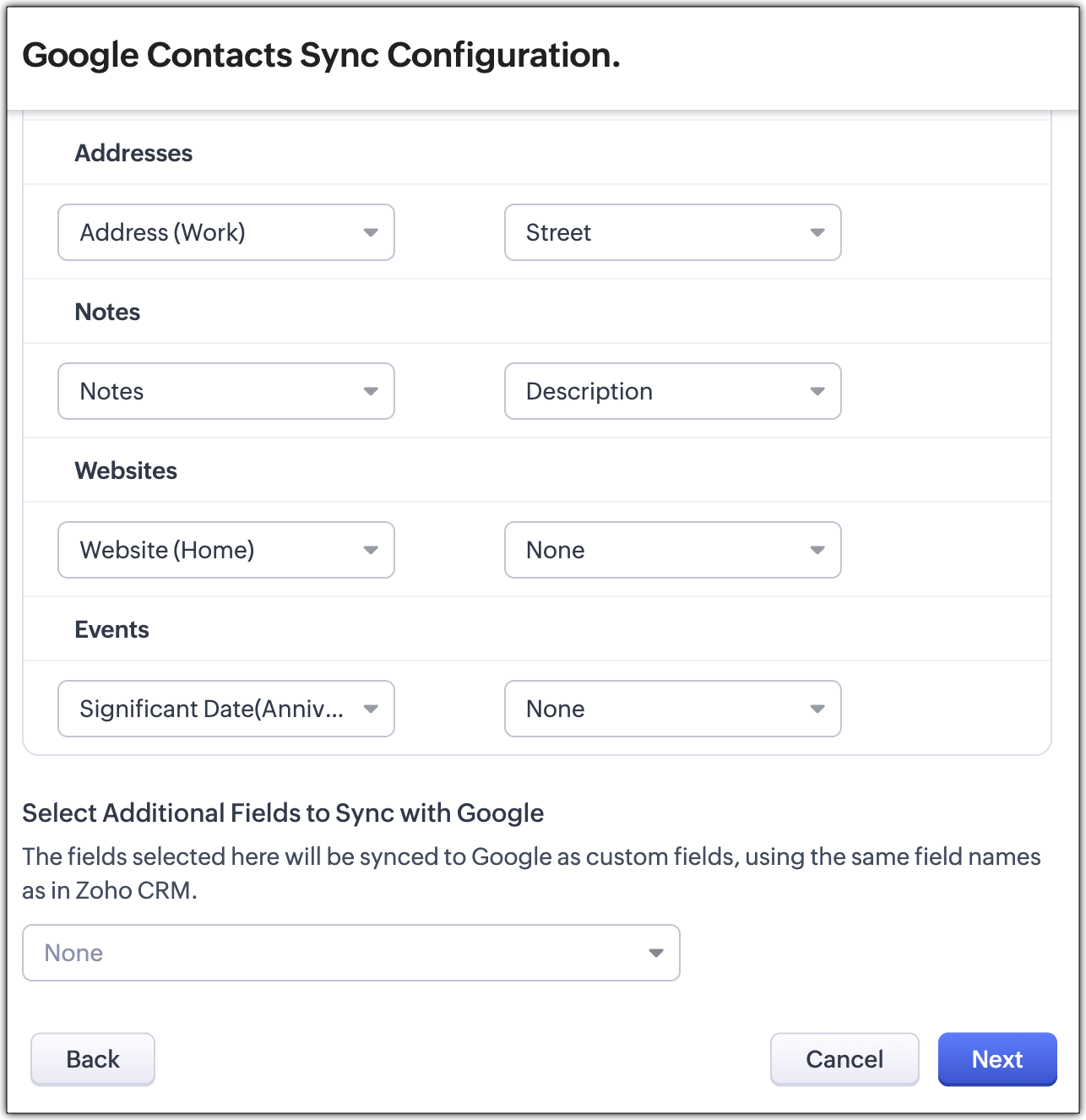- În partea de jos, sub Select additional fields pentru sincronizare cu Google, poți selecta câmpuri personalizate din meniul derulant pentru sincronizare cu Google.