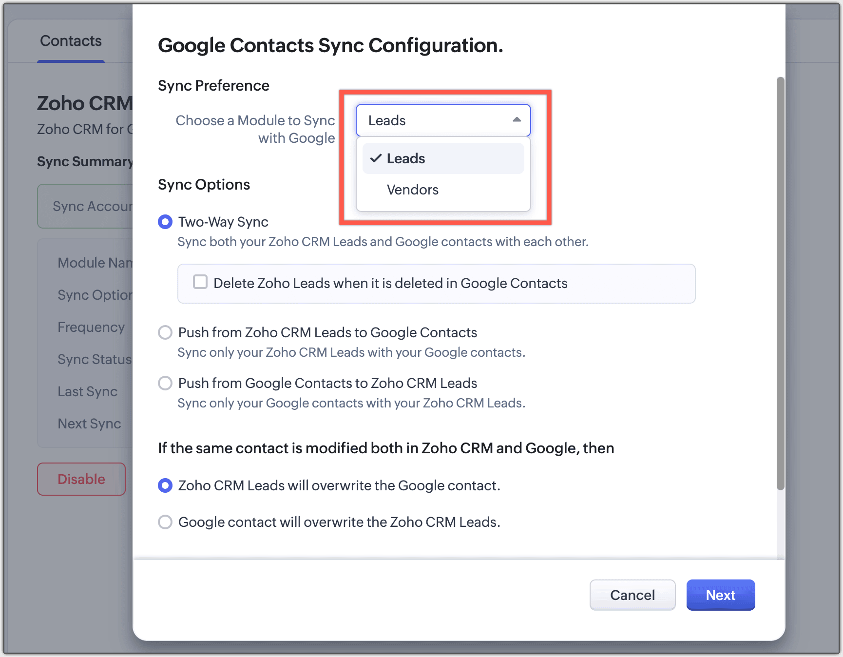 - Alege modulul de sincronizat cu Google. Trei module vor fi listate în meniul derulant: Contacts, Leads și Vendors.