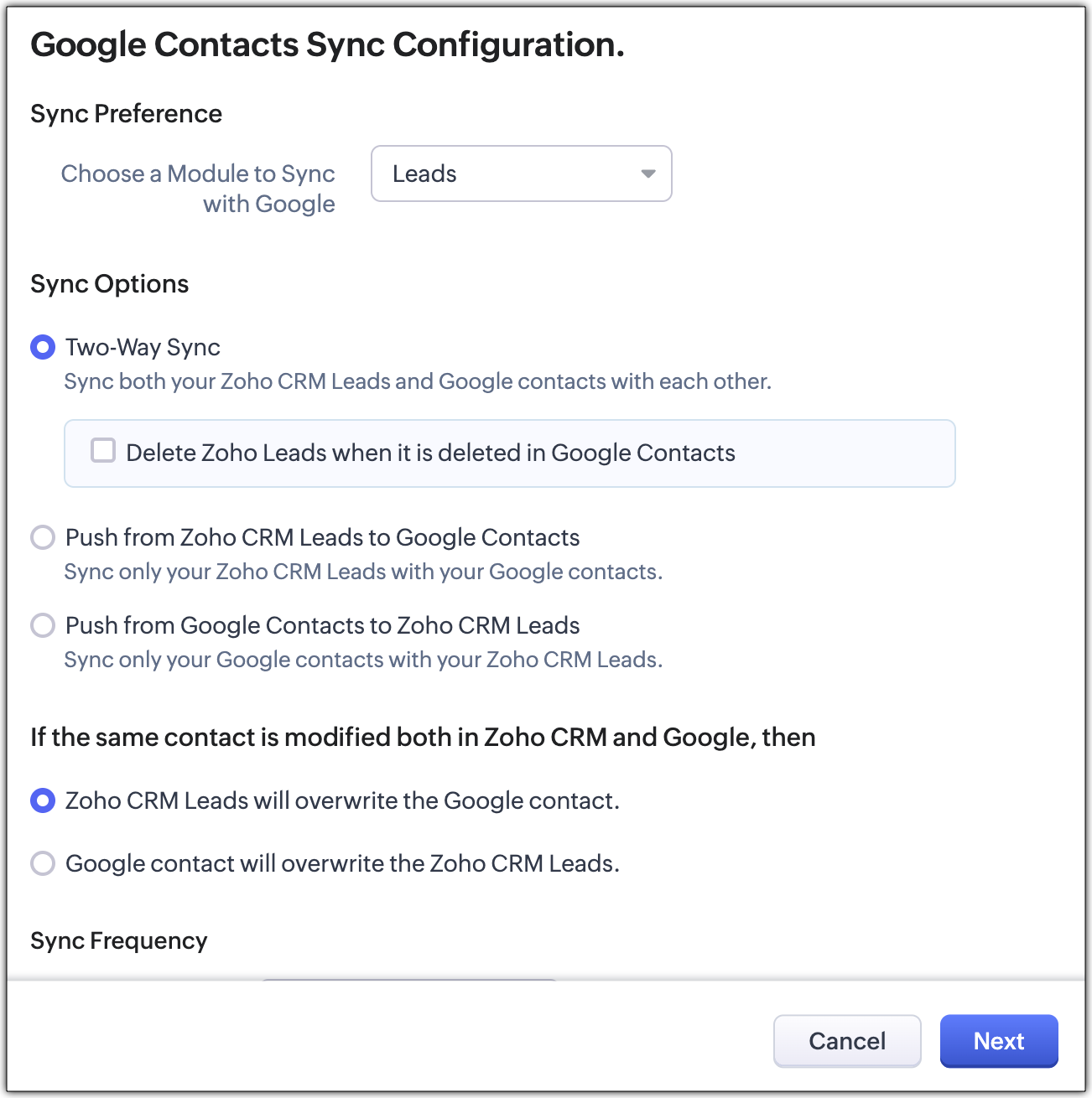 - Reține că doar contactele din grupul Google selectat și din vizualizarea de listă Zoho CRM selectată vor fi sincronizate. Contactele din CRM vor fi adăugate în grupul Google specificat.