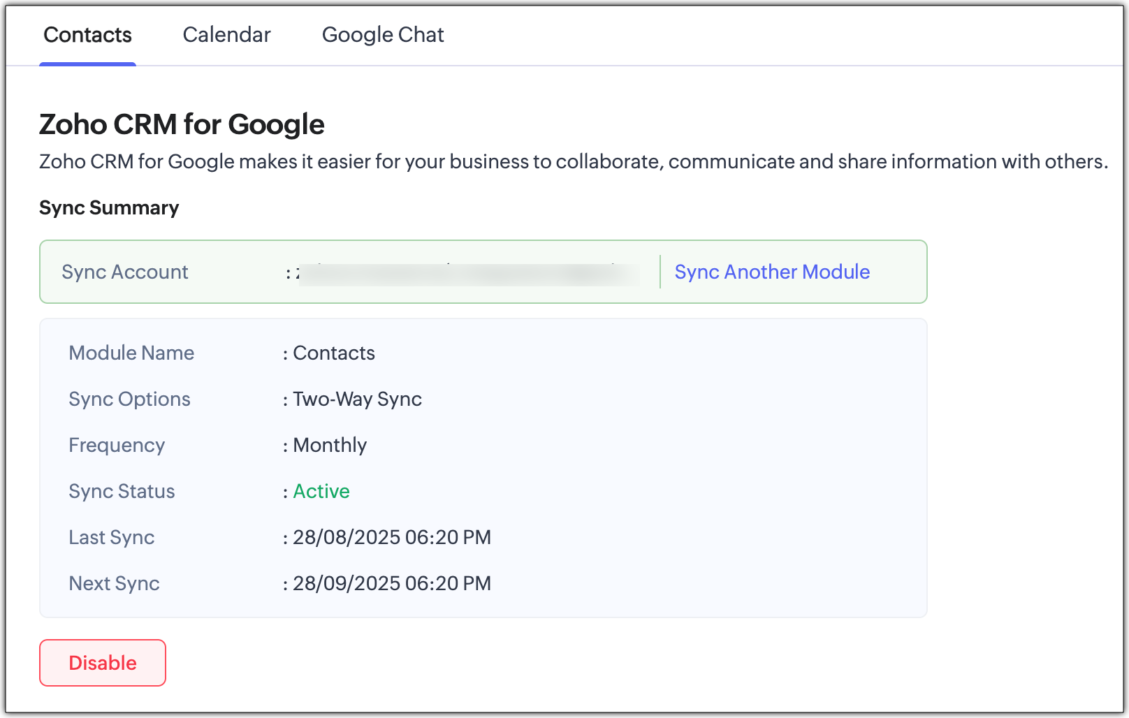 - În pagina Contacts Synchronization, apasă butonul Disable.