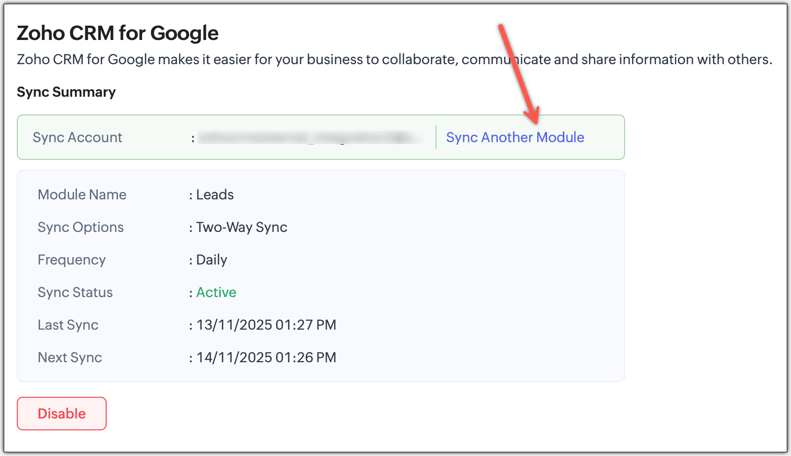 - În pagina Sync Summary, contul sincronizat va fi afișat. Apasă pe linkul Sync Another Module.
