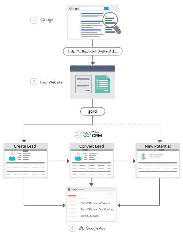 Potențialul client navighează pe site-ul tău și în cele din urmă completează formularul web. | Un cod de urmărire păstrează evidența GCLID-ului generat la clickul pe anunț. Acesta este menținut până când utilizatorul completează formularul și este transmis către Zoho CRM împreună cu detaliile completate în formular. |