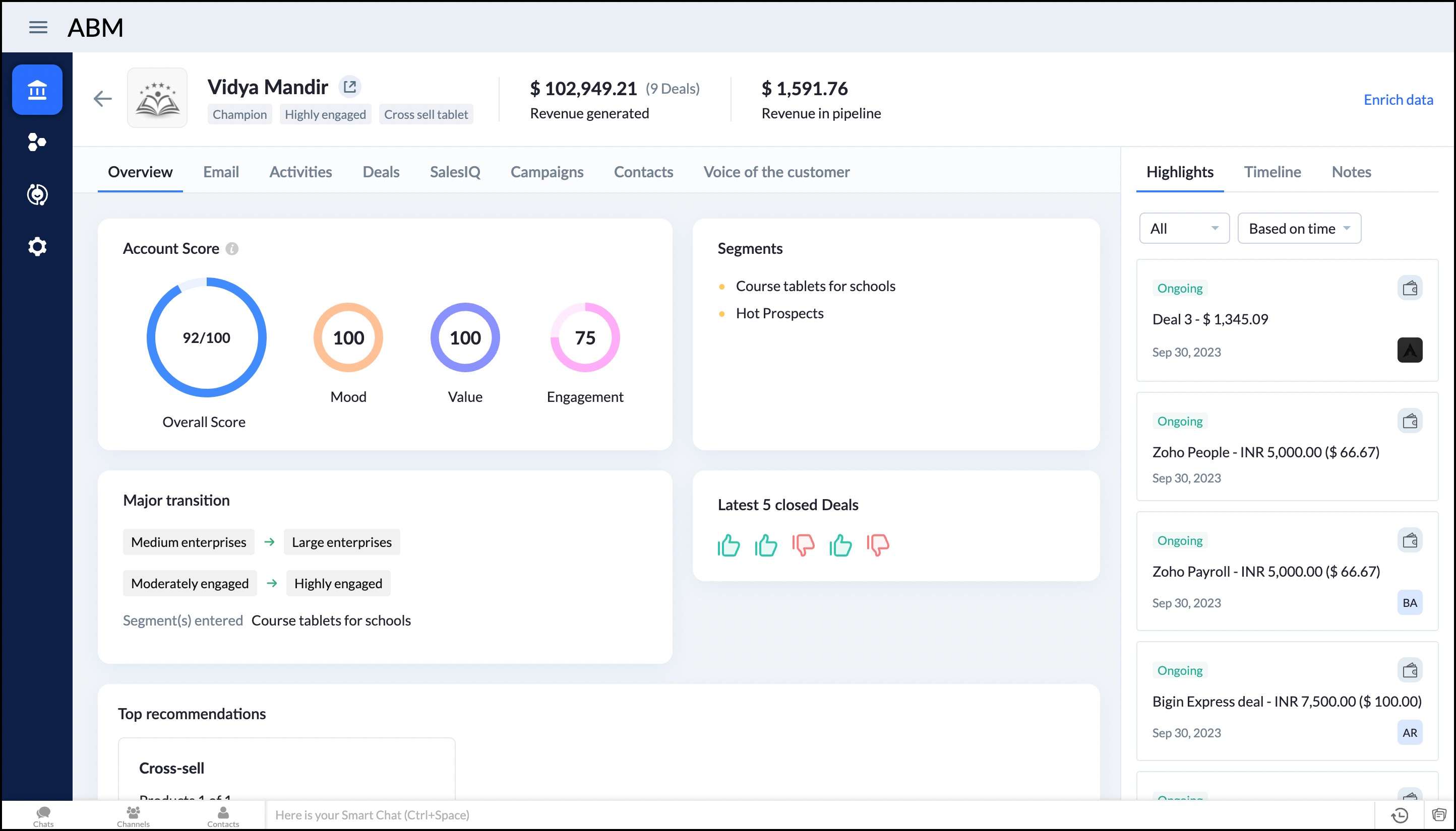 Un scor de cont mai ridicat indică în general că acel cont este mai susceptibil de a converti sau de a deveni un client valoros. Widget-urile ABM afișează adesea aceste scoruri pentru a ajuta echipele de vânzări și marketing să-și prioritizeze eforturile și să se concentreze pe cele mai promițătoare conturi pentru outreach și engagement personalizat.