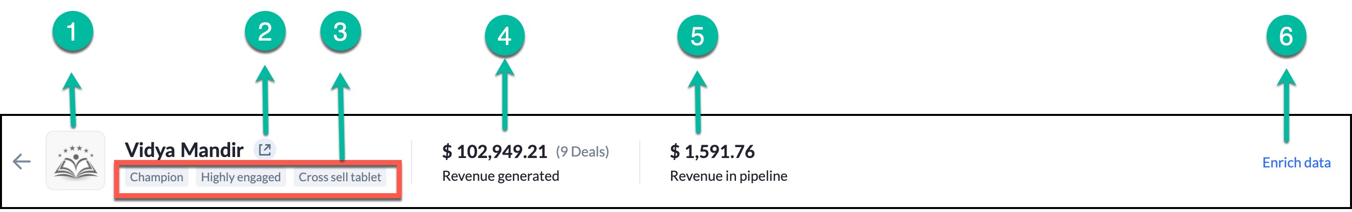 - Activitate cont: O cronologie sau un istoric al tuturor interacțiunilor, engagement-urilor și punctelor de contact dintre cont și eforturile tale de marketing și vânzări.