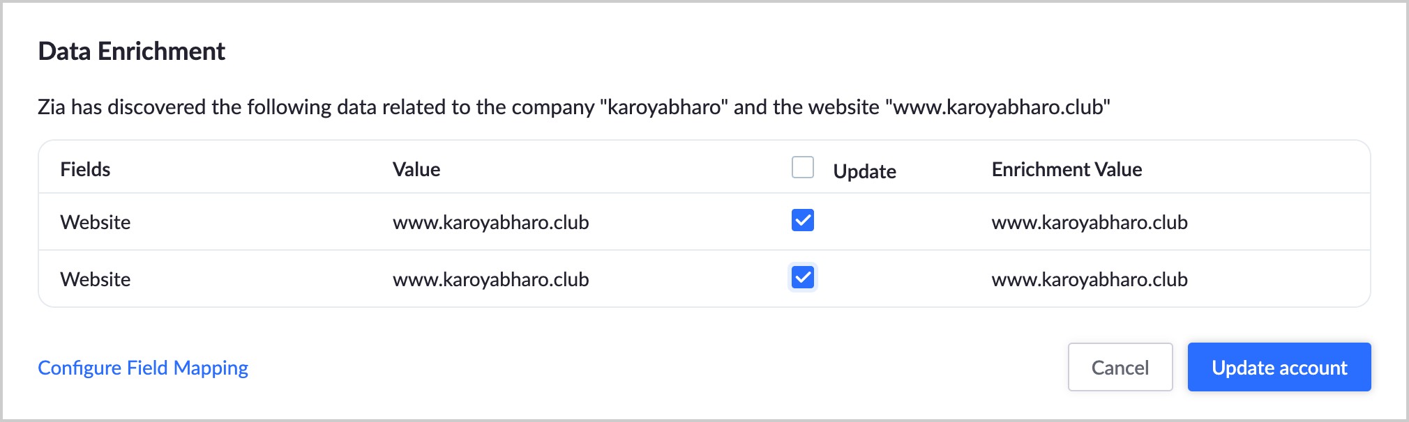 - Apasă pe Enrich Data pentru a vizualiza fereastra pop-up Data Enrichment care va afișa numele companiei și site-ul web al companiei. Pe baza acestor informații, poți actualiza contul.