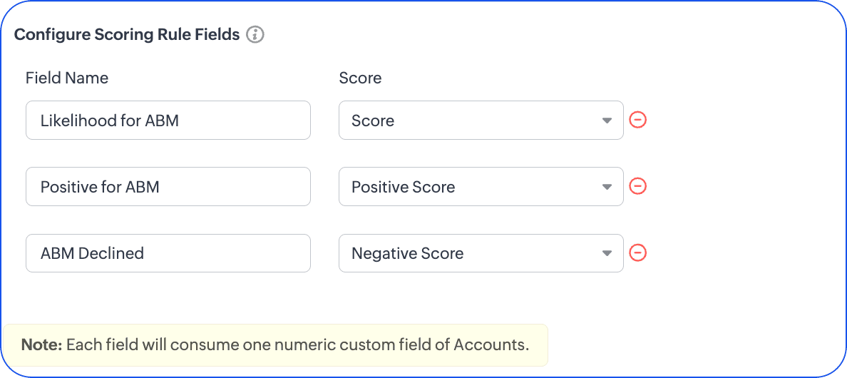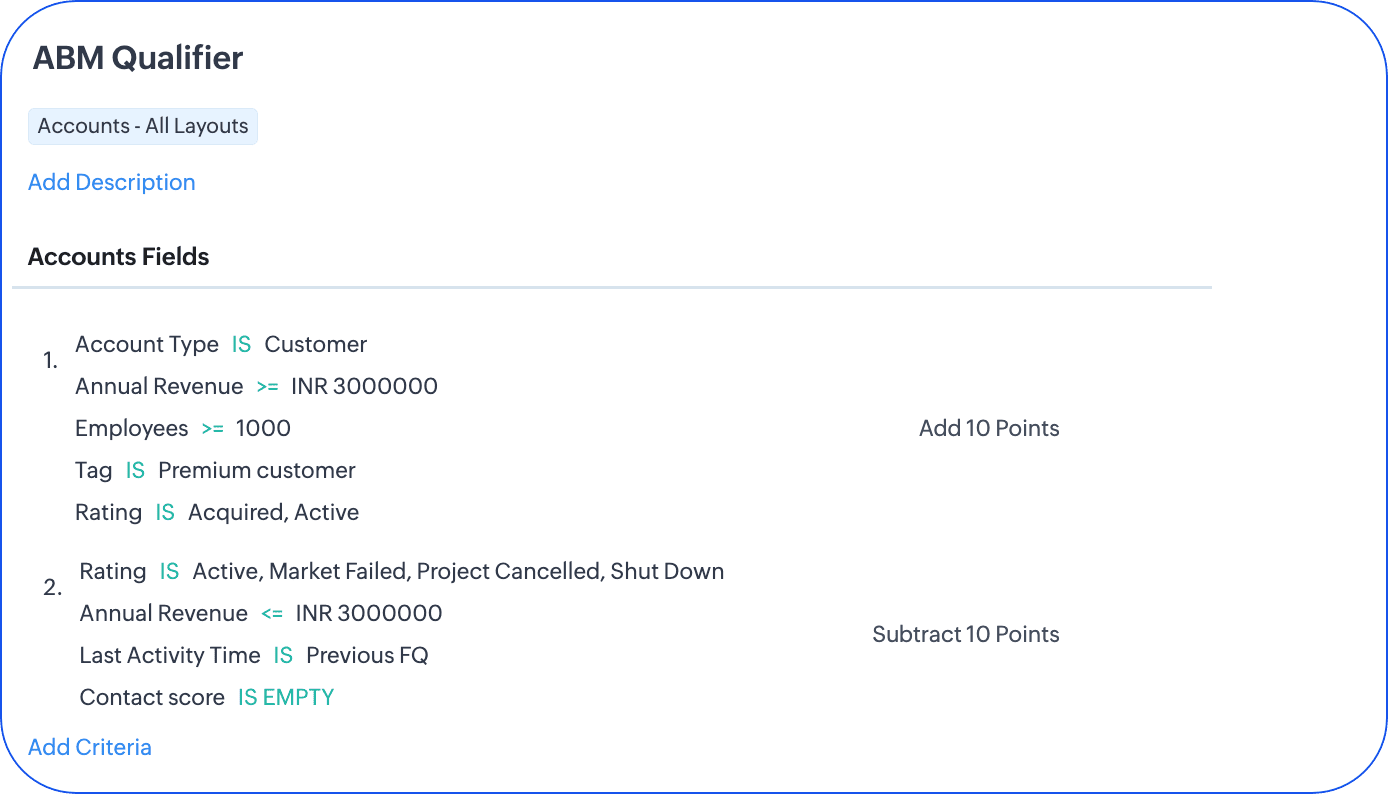 Calificarea conturilor implică evaluarea compatibilității lor cu ABM și a probabilității de succes în eforturile tale de cross-selling, upselling și retenție. Acestea fiind spuse, poți califica conturile folosind Scoring rules din Zoho CRM.
