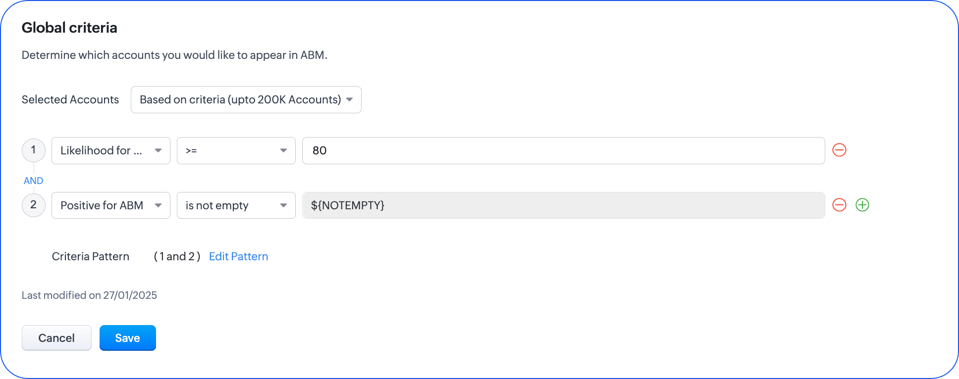Acest lucru îți va aduce scorul conturilor bazat pe firmografie și scorul contactelor bazat pe angajament în conturile tale și în cele din urmă în contul tău ABM prin Criteriile globale. - Aceste scoruri preluate din contactele tale, deoarece sunt câmpuri, pot fi folosite și pentru a crea segmentare. Această soluție alternativă poate fi folosită pentru alte module CRM pentru a-ți afirma calificarea pentru programul tău ABM.