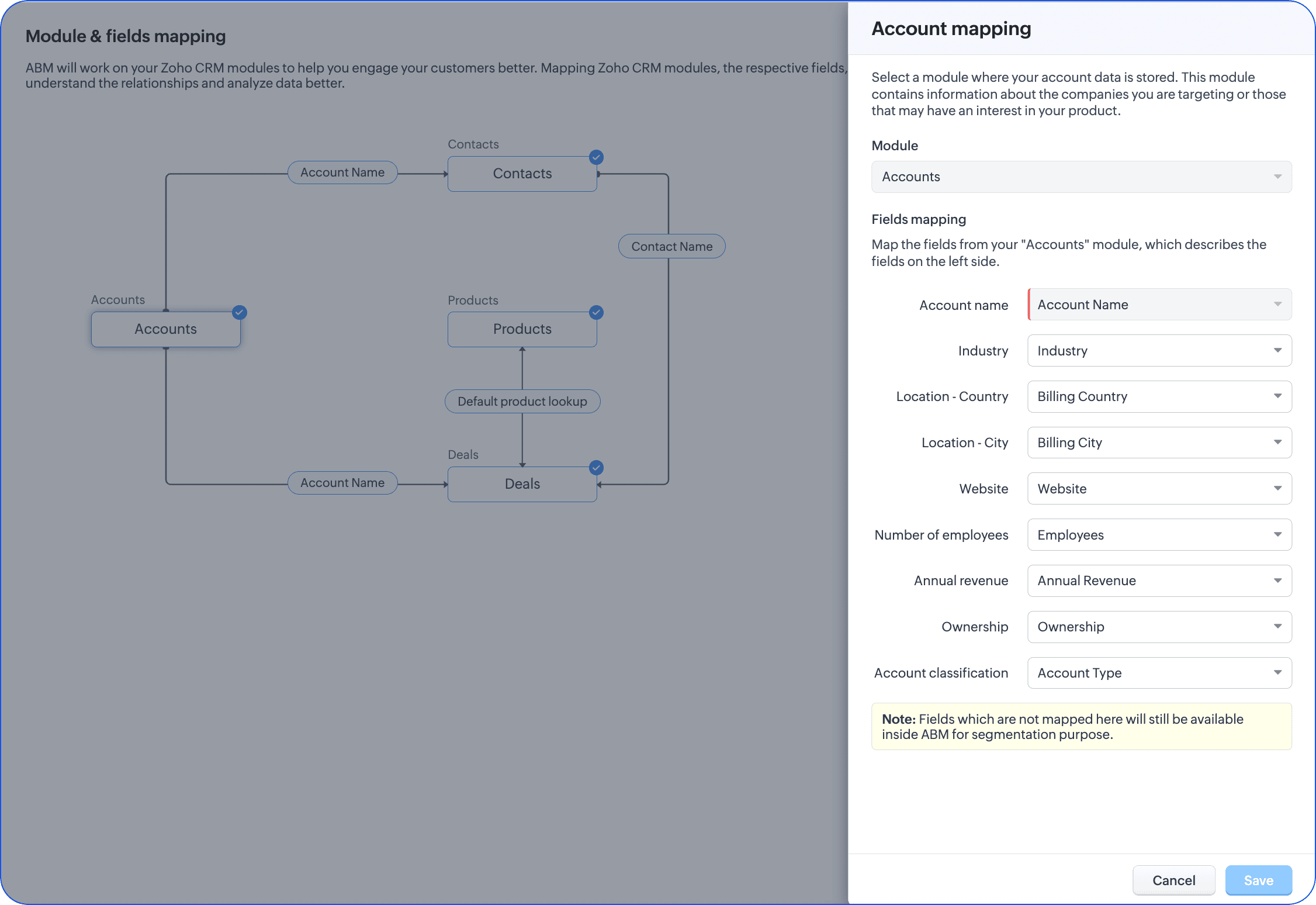 - ABM necesită conturi și informațiile asociate despre personal și tranzacții. Deci, are nevoie de modulele Accounts, Deals, Contacts și Products pentru a fi mapate. Dacă gestionezi aceste tipuri de informații într-un modul personalizat, acestea pot fi folosite pentru mapare.
