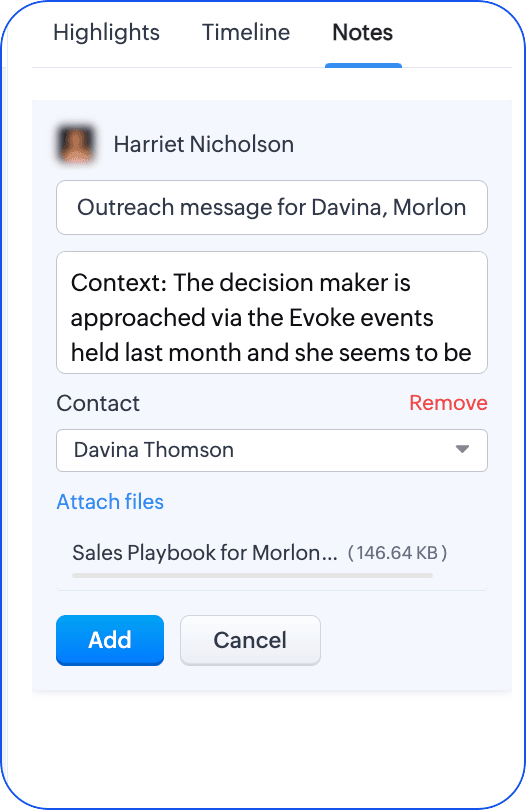 Fiecare cont din instrumentul ABM vine cu un spațiu colaborativ numit Notes. De la termenii de abordare la partajarea materialelor de marketing personalizate, poți folosi Notes și te poți sincroniza cu conturile respective. Această sincronizare va înregistra aceste informații în Zoho CRM, din care echipa de vânzări poate înțelege obiectivele de marketing. Dacă este necesar, poți asocia nota și cu un contact specific. De exemplu, Davina de la Morlong associates este un factor de decizie cheie. Poți atribui un sfat personalizat de outreach pentru echipa de vânzări prin asocierea unei note la contactul ei.