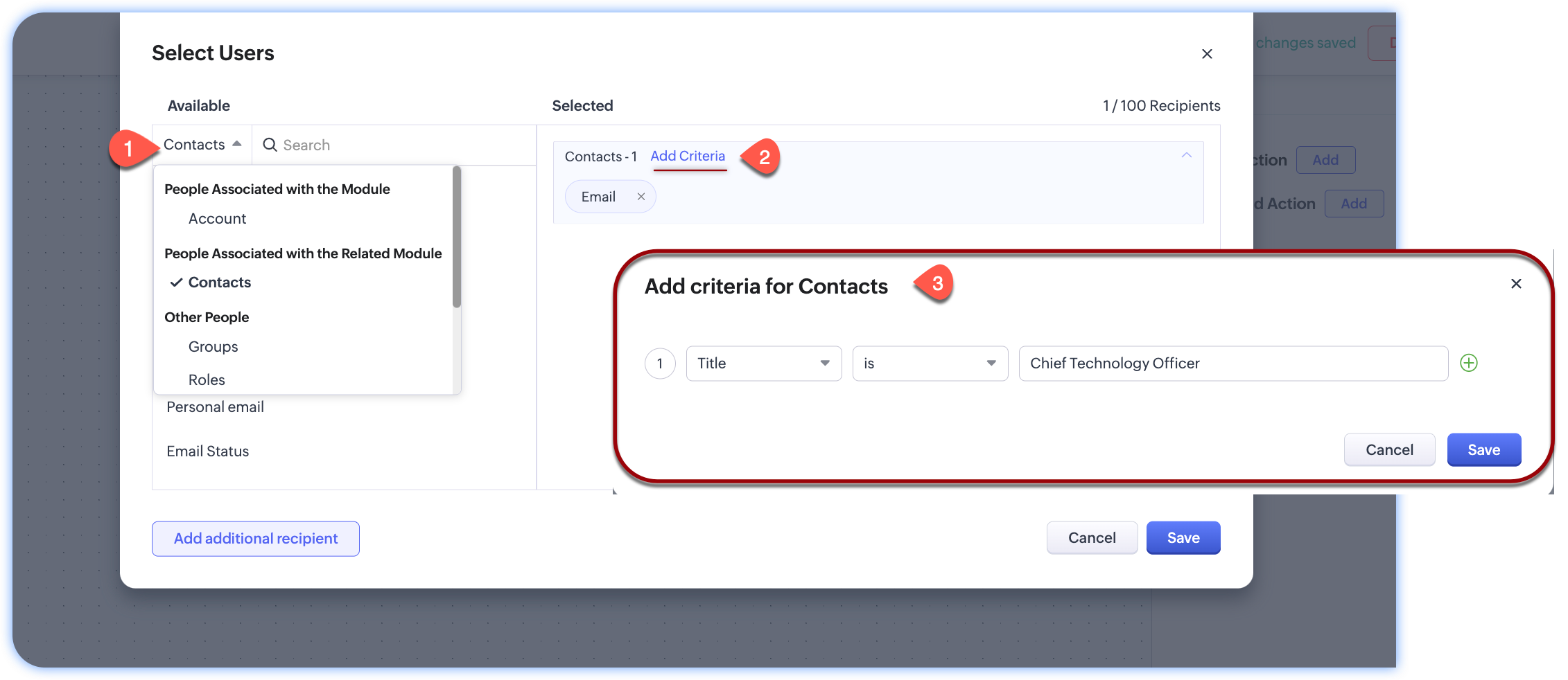 Pentru a automatiza un e-mail doar către factorii de decizie, pe măsură ce atribui un e-mail unei acțiuni, poți adăuga criteriile de contact. De exemplu: Chief Technology Officer.