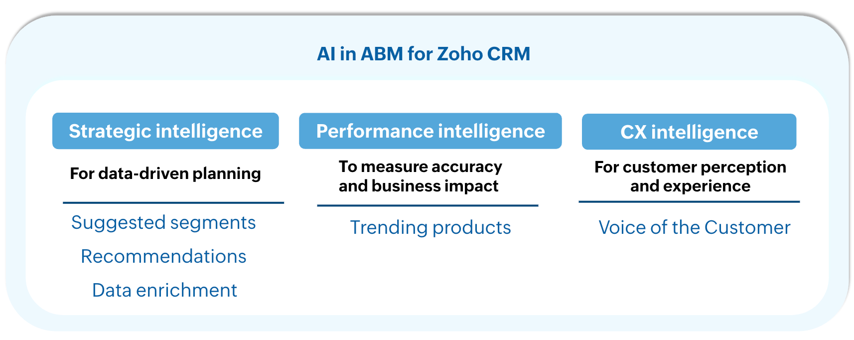 Notă: Lucrăm constant la dezvoltarea unei sincronizări de date strâns integrate cu Zoho CRM și alte instrumente/platforme, astfel încât fluxul de date va fi mai fluid, iar sugestiile de mai sus sunt doar soluții alternative pentru moment.Ce capabilități AI diferite are ABM?