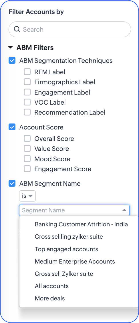 Folosind baza de date bogată de conturi din Zoho CRM, ABM for Zoho CRM este conceput pentru a-ți segmenta conturile cu atribute mai fine și a interacționa cu ele la nivel personalizat. Prin colectarea datelor calificate despre conturi generate de echipa ta de vânzări, ABM for Zoho CRM le oferă marketerilor tăi o platformă focalizată pentru a strategiza expansiunea, retenția și a derula interacțiuni exclusive pentru conturile tale nominalizate. Cu alte cuvinte, instrumentul îți permite să conduci vânzări exclusive bazate pe conturi cu contribuțiile marketerilor.