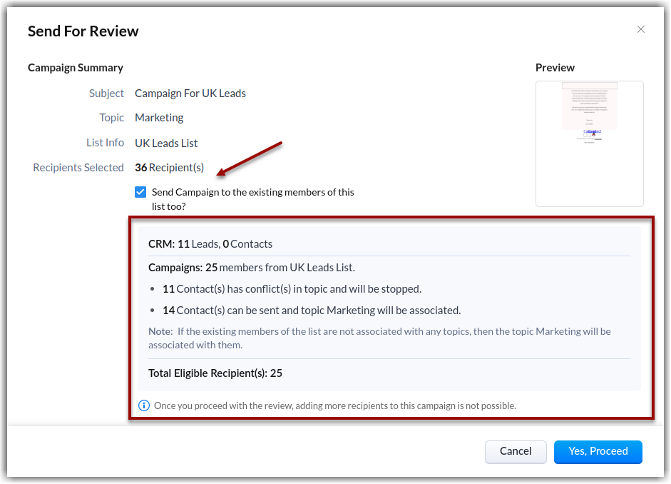 - Bifează caseta Send Campaign to the existing members of this list too în pop-up-ul Send for Review dacă vrei să trimiți campania și membrilor existenți ai listei, nu doar noilor destinatari.