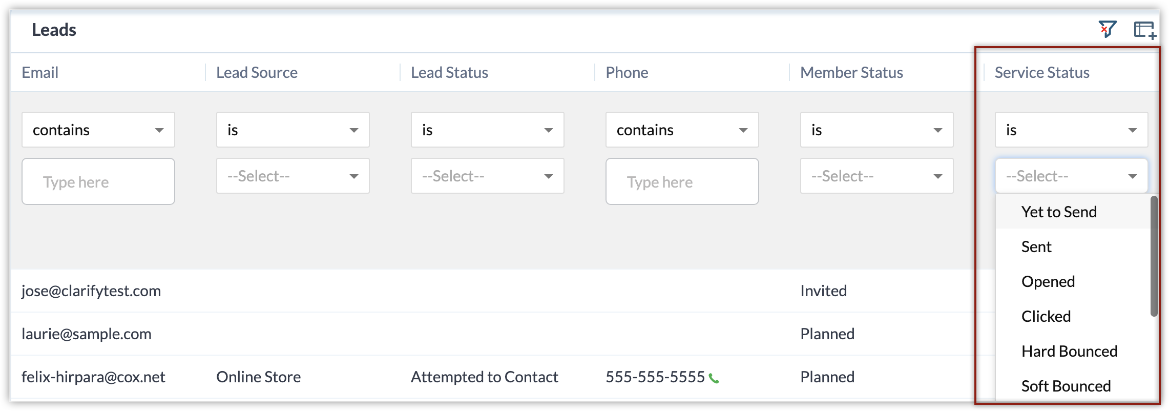 - În modulul Campaigns, mergi la lista asociată Leads sau Contacts.