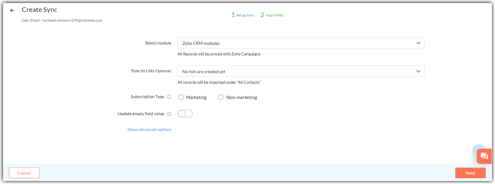 - Sync to Lists: În acest pas opțional, poți sincroniza orice liste de corespondență pe care le ai în Zoho Campaigns sau poți crea o listă nouă.