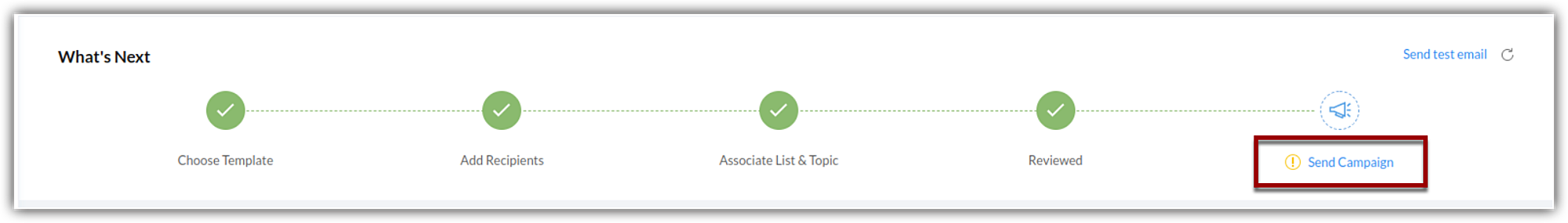 Notă: Opțiunea Send Test Email îți permite să trimiți un email de test către până la cinci adrese de email simultan pentru a verifica conținutul înainte de a-l trimite destinatarilor. - Apasă Send Campaign în secțiunea What's Next din pagina de detalii a campaniei