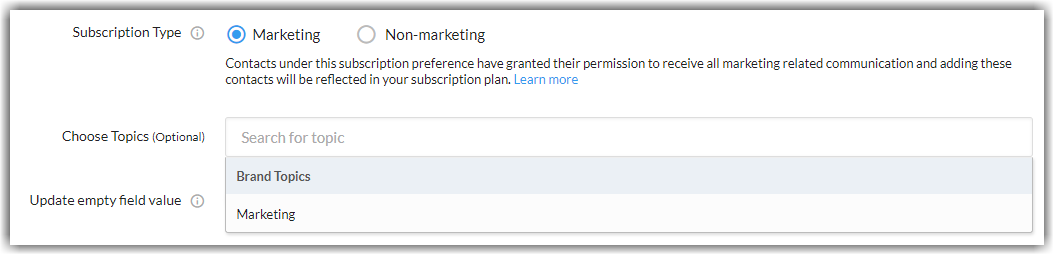 - Subscription Type: Selectează dacă abonamentul este Marketing sau Non-marketing.