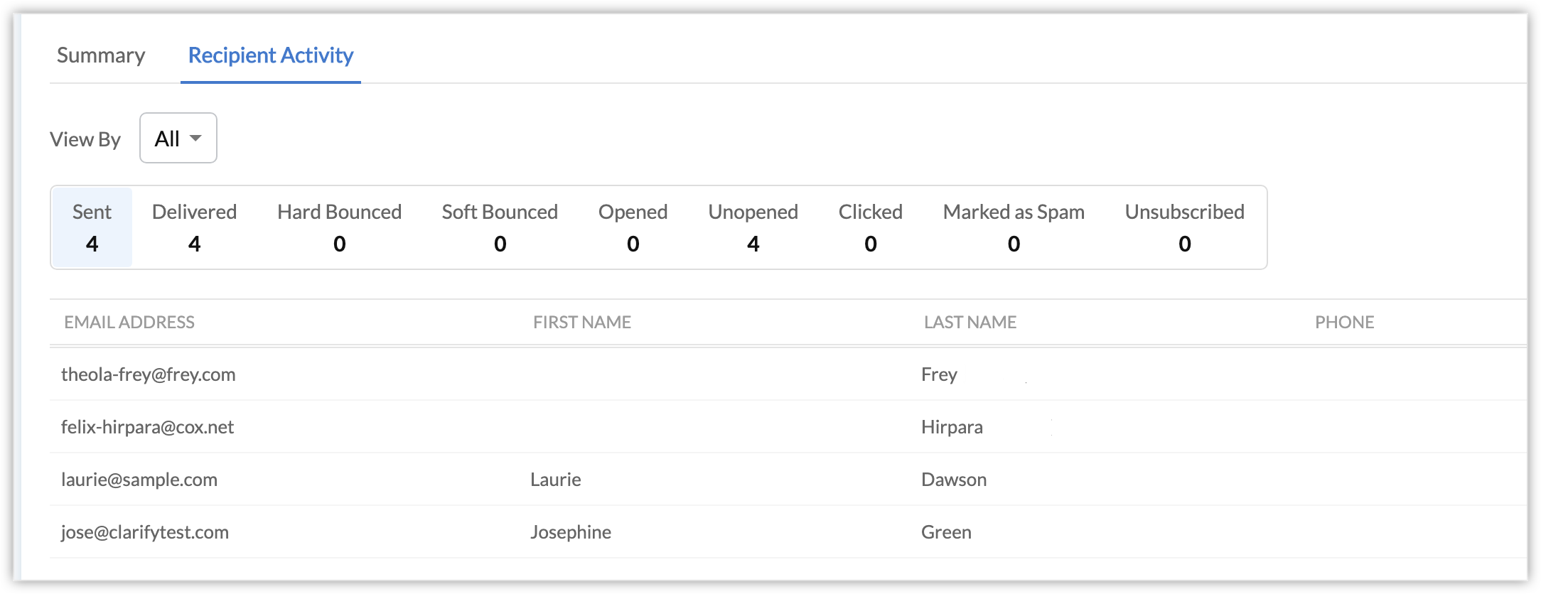 - Apasă pe mesajele individuale ale campaniei din lista asociată numită Child Campaigns pentru a vizualiza detaliile respective de Summary și Recipient Activity.