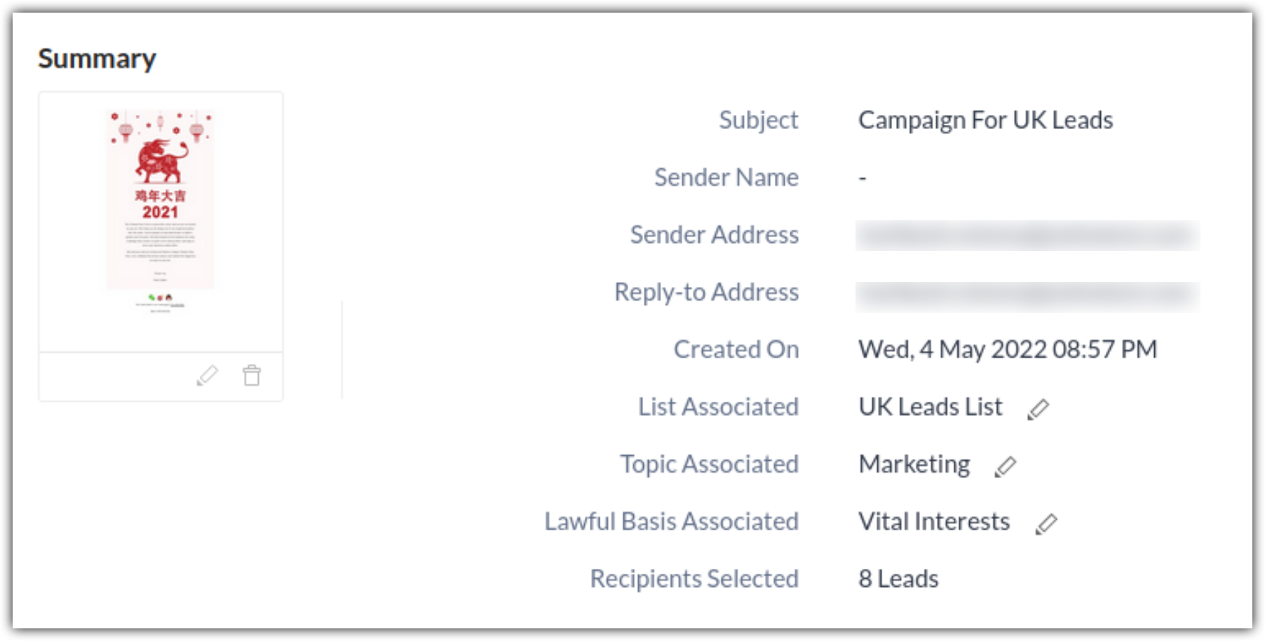 Notă: Folosește pictograma edit/delete pentru a edita sau șterge conținutul emailului înainte de a trimite campania. Editarea template-ului după ce a fost trimis pentru revizuire va muta campania în ciornă și trebuie să o trimiți din nou pentru revizuire.