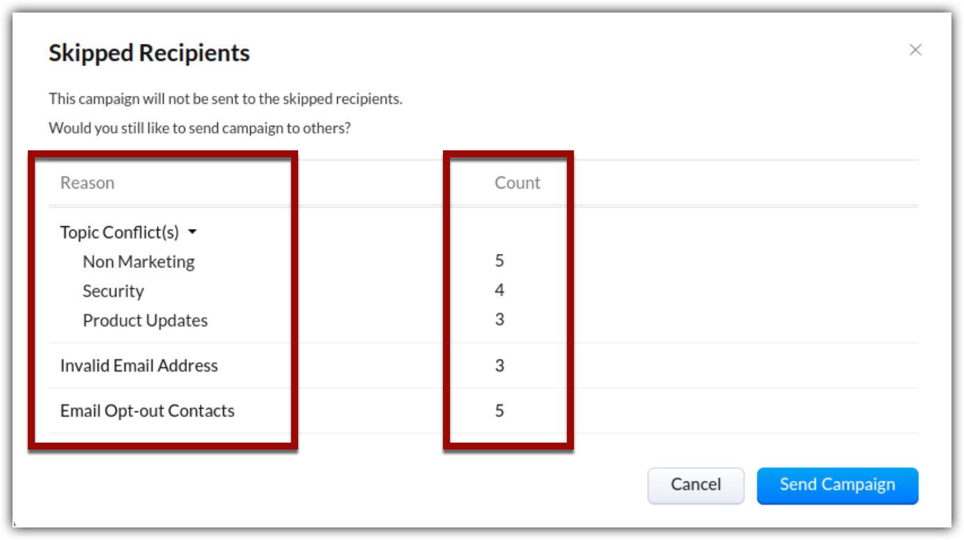 Utilizatorii pot verifica detalii, cum ar fi motivul omiterii - Topic Conflicts, Invalid Email Address, Email Opt-out Contacts, etc. și numărul de destinatari omișii pentru fiecare motiv. La expandarea conflictelor de subiecte, pot obține categorizarea detaliată a subiectelor particulare și numărul respectiv de destinatari omișii.
