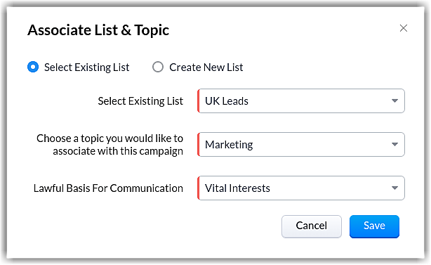 Selectează Lawful Basis for Communication din lista de opțiuni disponibile.