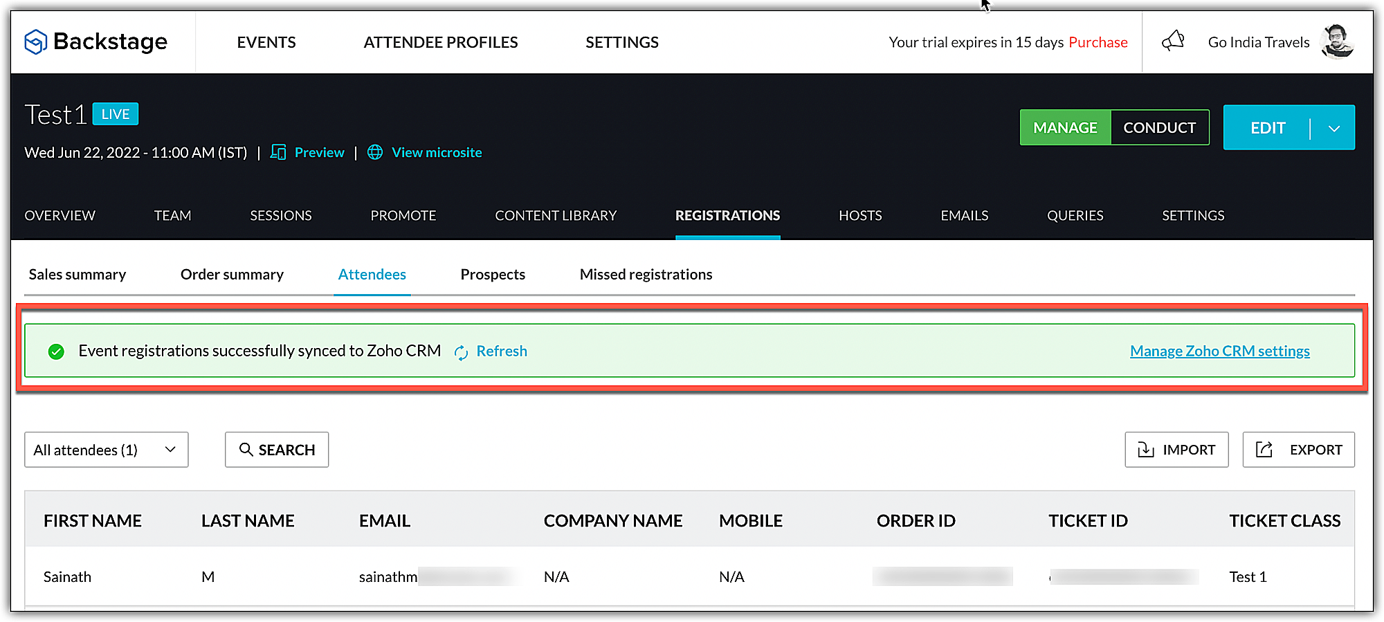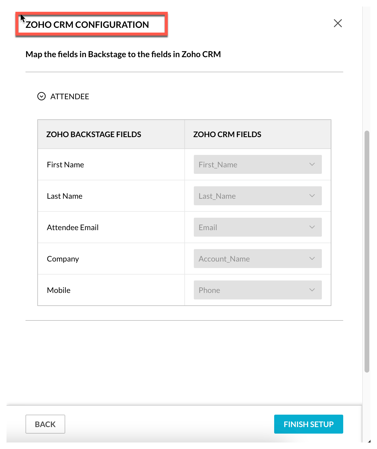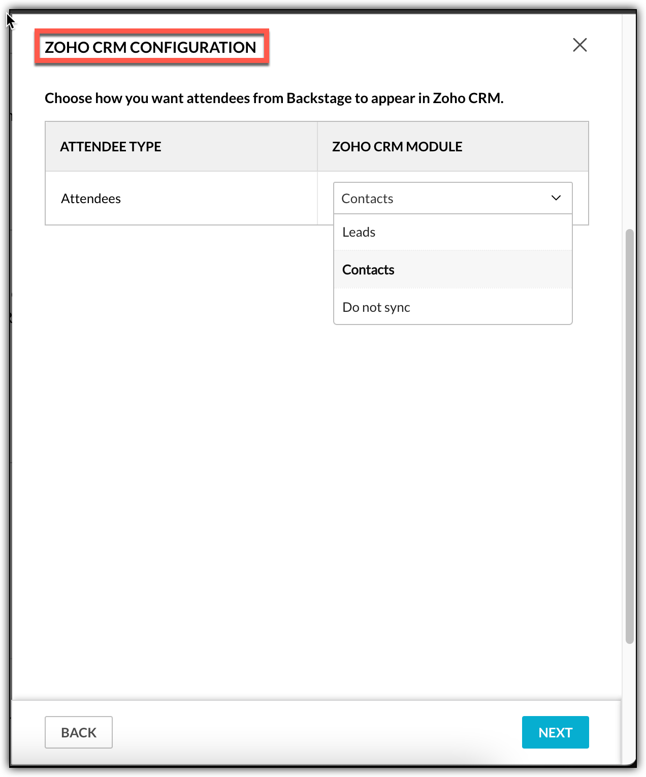 După ce ai integrat cu succes Zoho Backstage cu Zoho CRM, trebuie să îl configurezi în secțiunea Integration din meniul Settings al Zoho Backstage. Este posibil ca în timpul configurării, participanții să nu fi fost sincronizați cu modulul Lead sau Contacts. Trebuie să îl configurezi astfel încât participanții să fie reflectați fie în modulul Contacts, fie în modulul Lead.