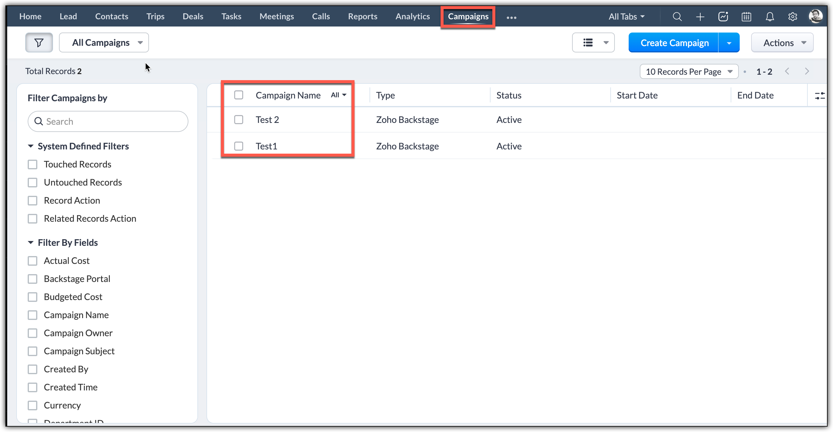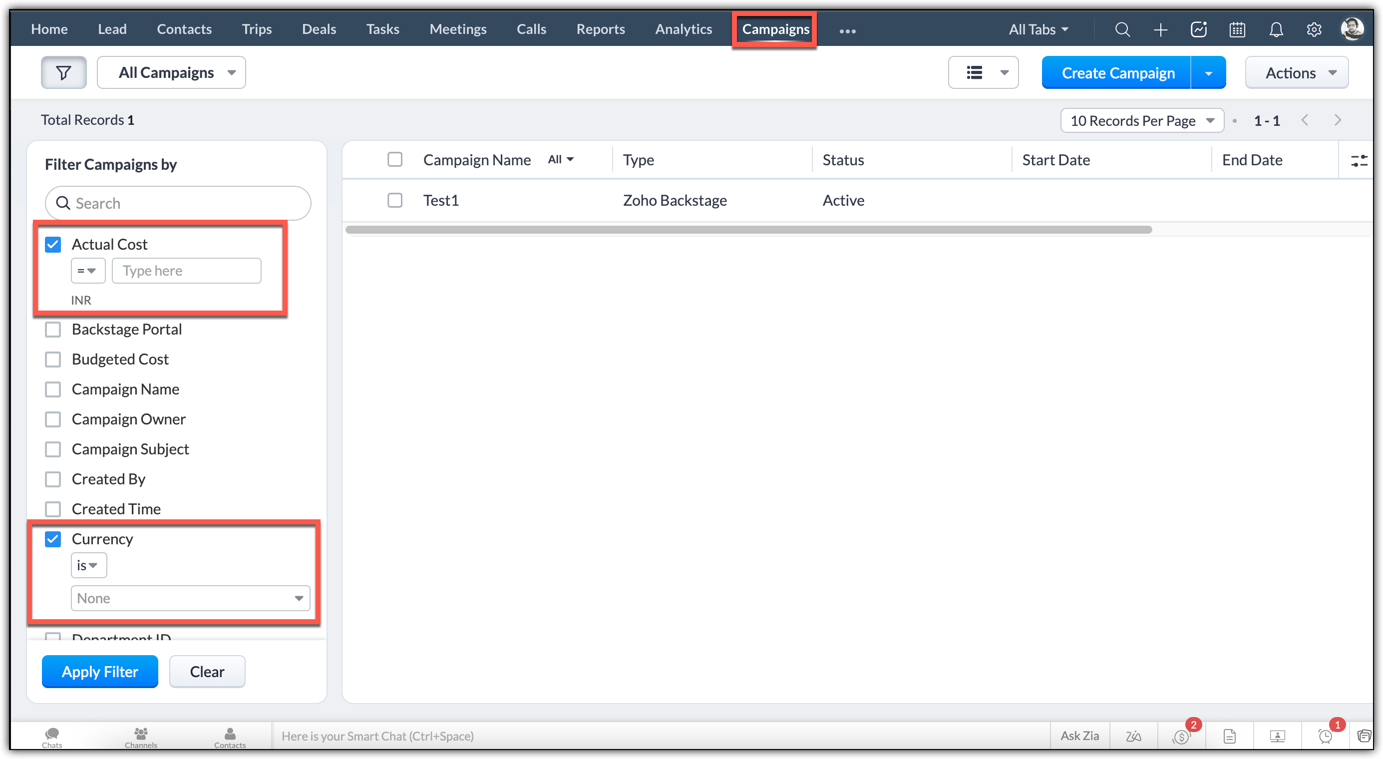 Costul, cheltuielile, și moneda vor fi reflectate în fila Filter Campaigns by din modulul campaigns al CRM-ului tău.