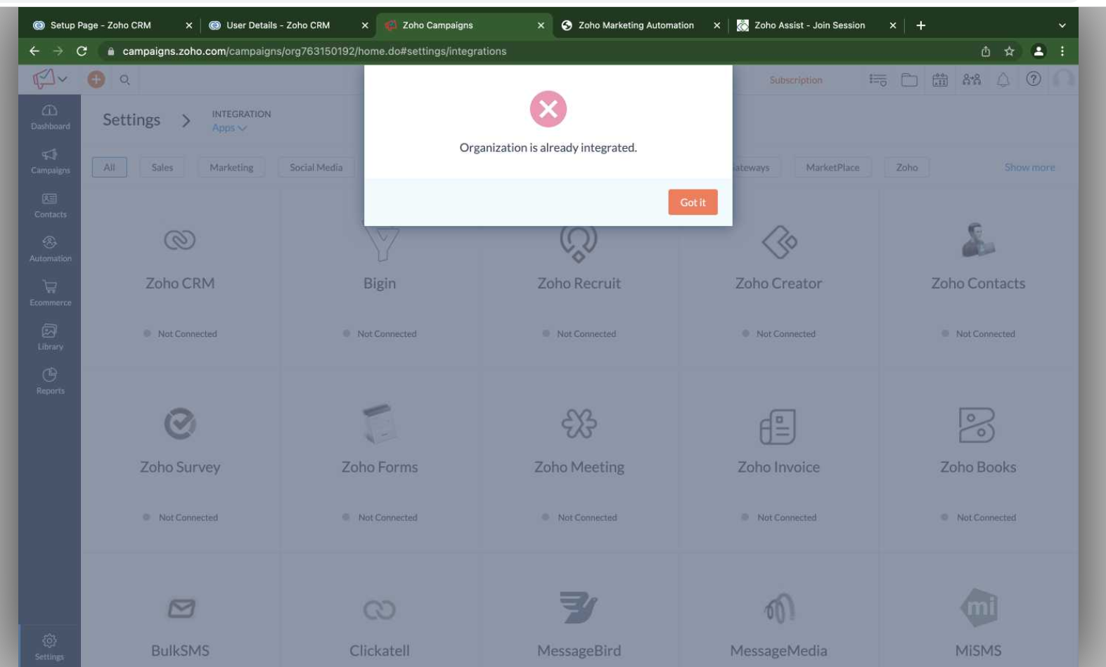 Dacă ți-ai asociat deja contul CRM cu Zoho Backstage, la momentul integrării vei primi un mesaj de eroare care spune „Organizația ta este deja integrată." Trebuie să verifici dacă contul tău este deja asociat sau nu. Dacă este deja asociat cu un cont vechi, poți pur și simplu să ștergi vechea integrare și să creezi una nouă. Dacă nu îți amintești să fi făcut vreo integrare anterioară, verifică cu echipa ta de dezvoltare. În cele mai multe cazuri, integrarea a fost deja realizată cu un cont vechi care a fost uitat. Acesta ar putea fi un cont de test sau un cont de probă.