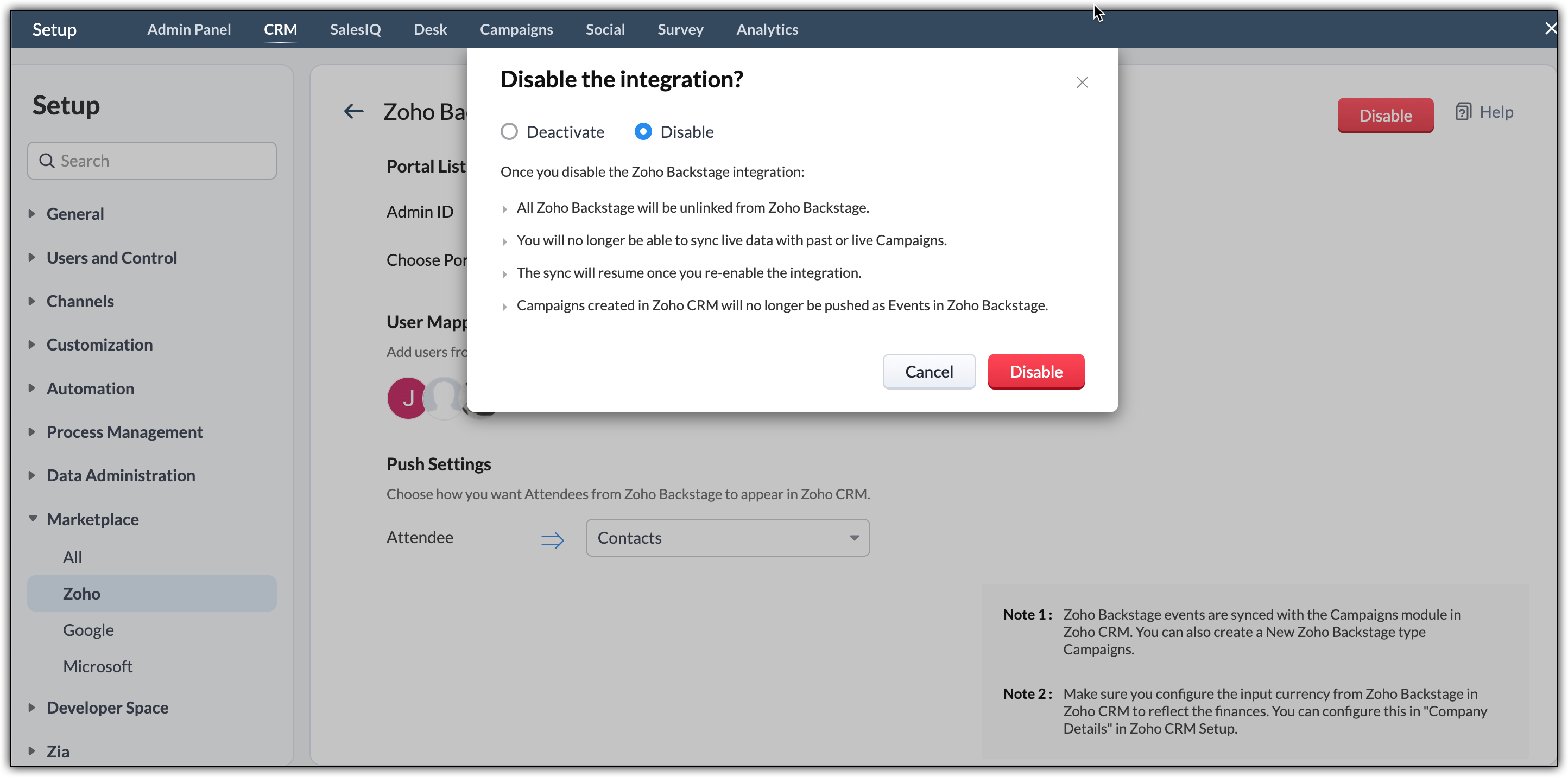 Pentru a copia câmpul de personalizare din contul tău CRM, trebuie să dezactivezi integrarea dintre contul tău CRM și Zoho Backstage. Ștergerea integrării va desface asocierea tuturor datelor dintre Backstage și contul tău CRM. Sincronizarea va fi dezactivată și nu vei putea sincroniza date live. Nu șterge integrarea și nu o dezactiva. În schimb, doar Dezactivează integrarea temporar.