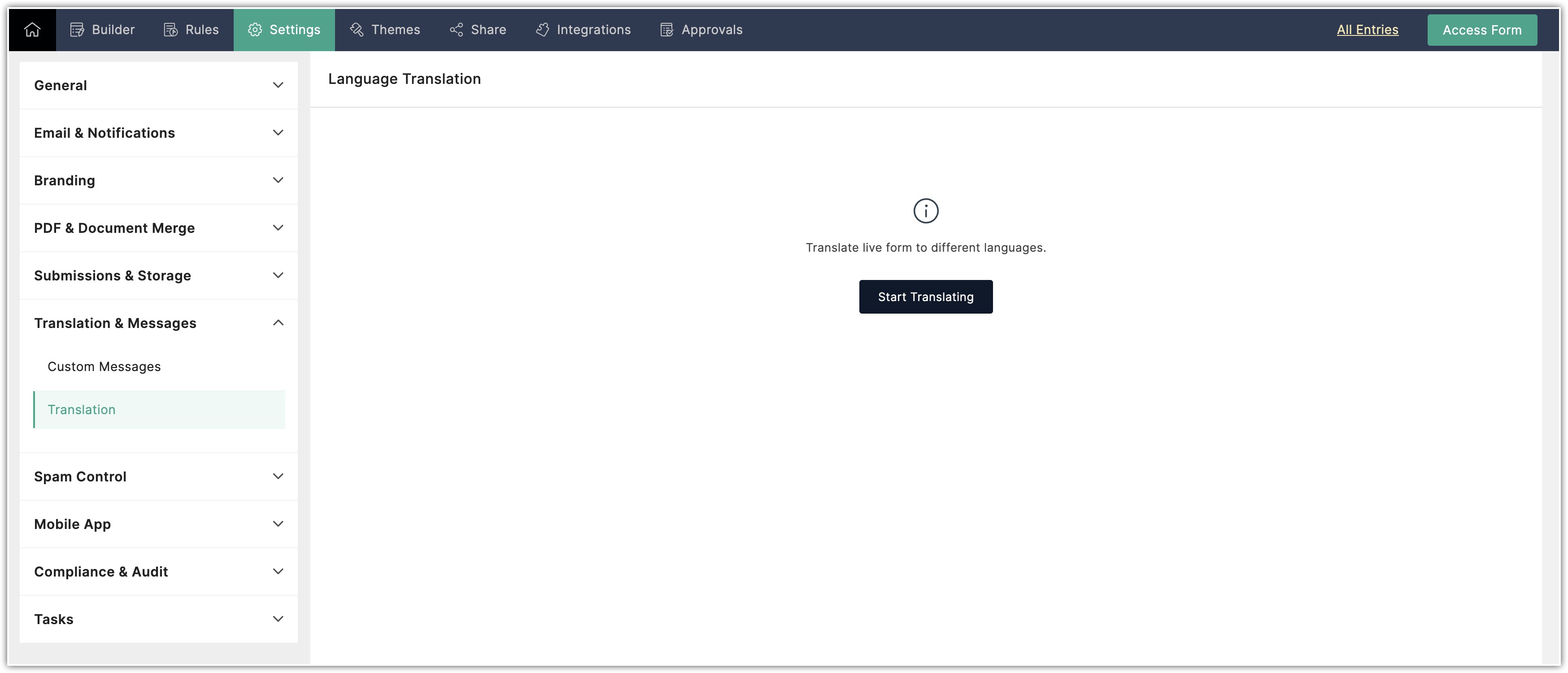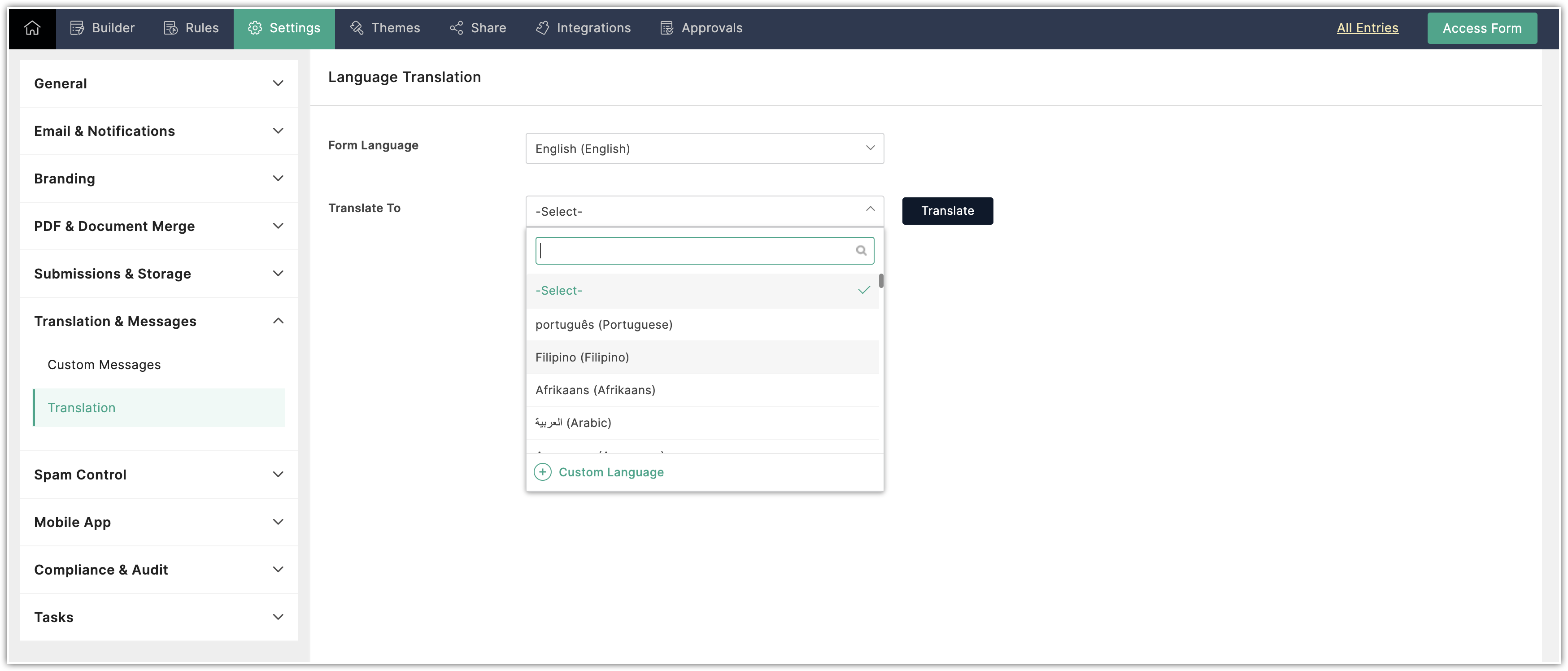 - După ce ai creat formularul, navighează la Setări > Traducere și mesaje > Traducere.
