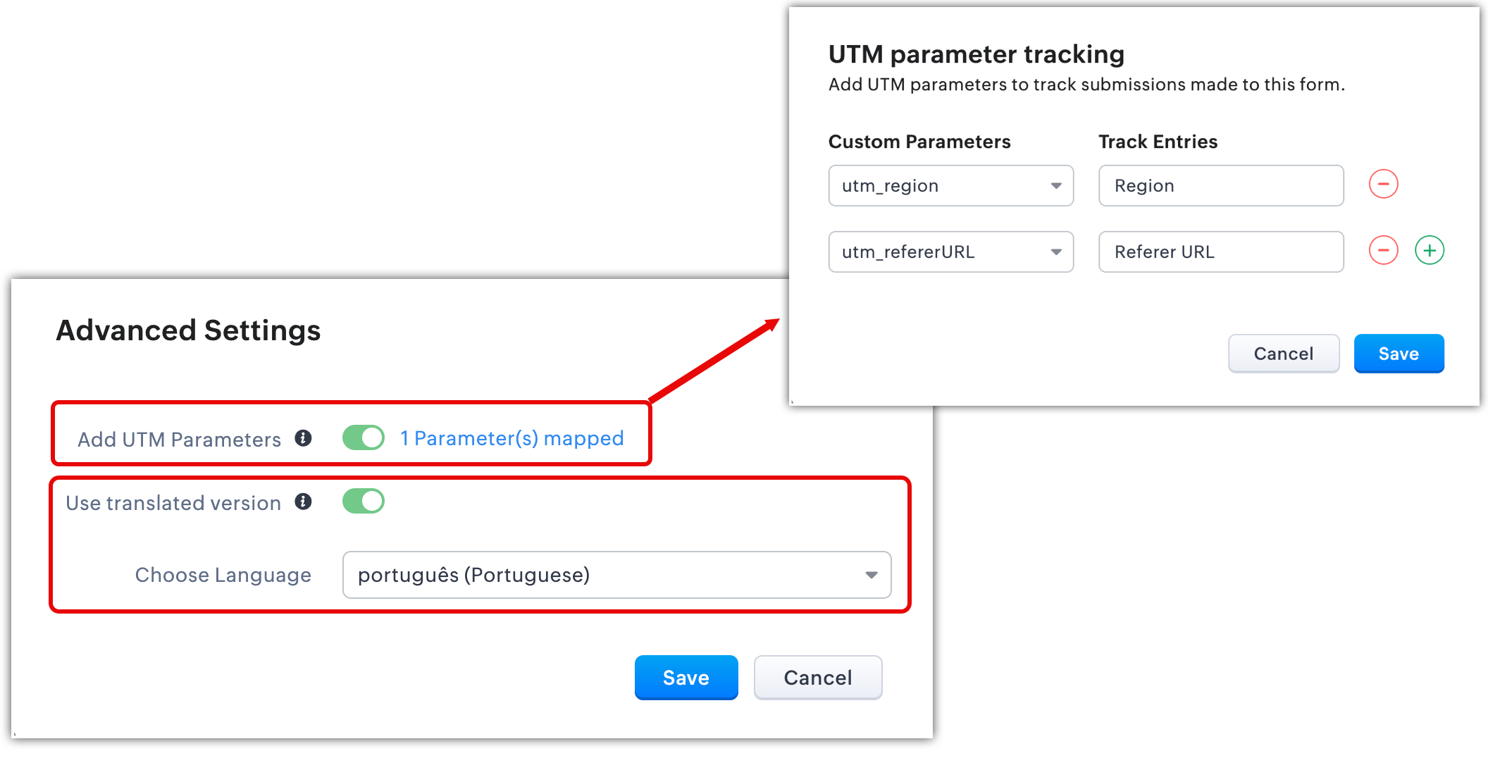 - În fereastra pop-up de setări avansate, poți adăuga parametri UTM pentru urmărire și alege să folosești o versiune tradusă a formularului.