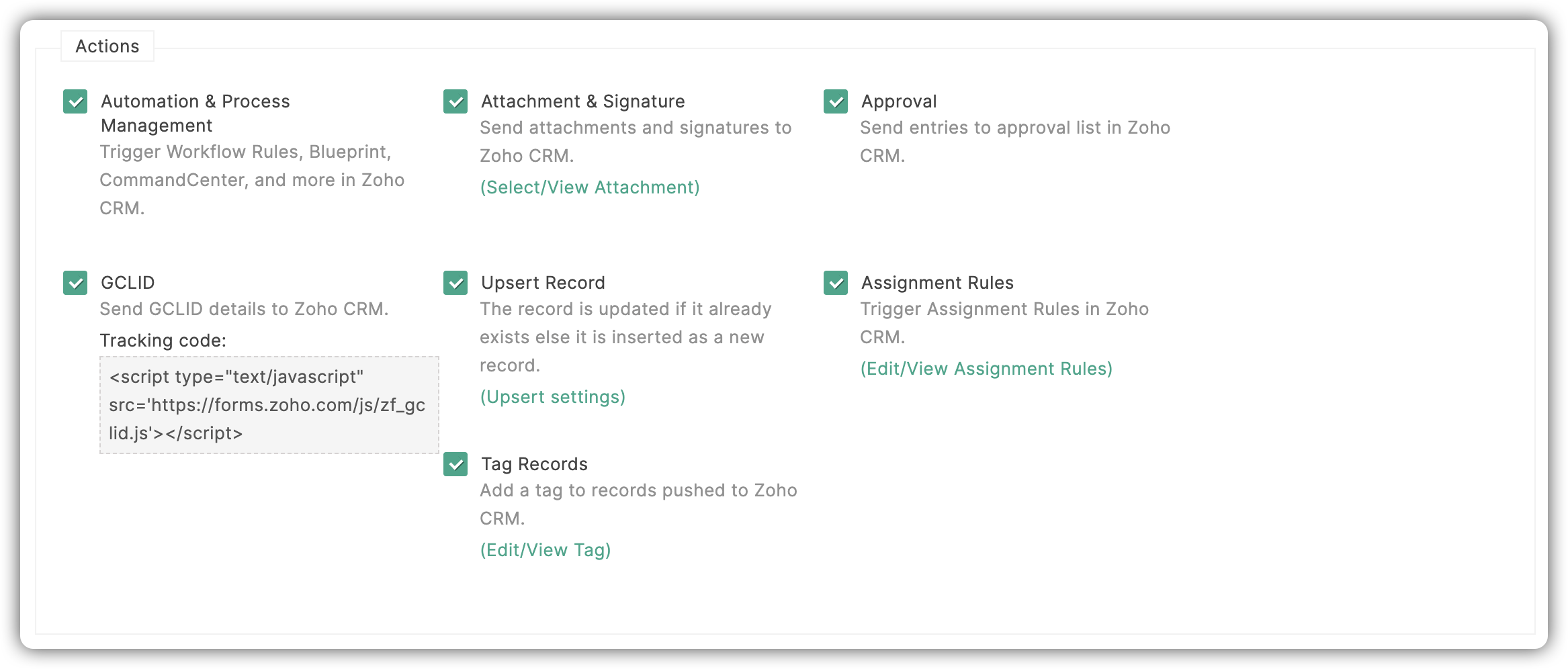 Acțiuni - Uneori poți dori să efectuezi anumite acțiuni când un formular este trimis. Zoho Forms îți permite să efectuezi anumite acțiuni.