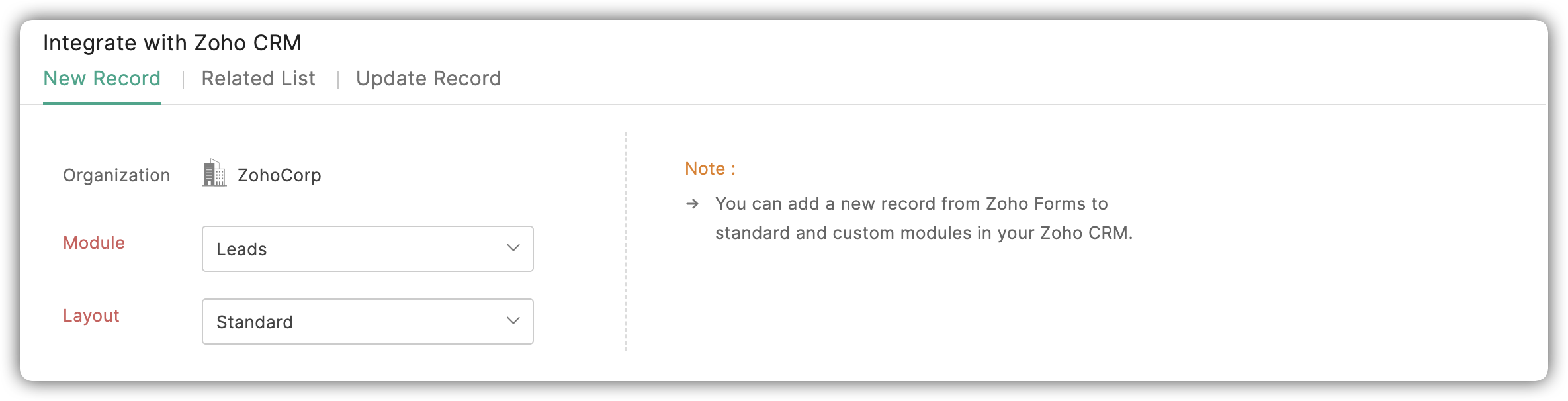 - Accesează tab-ul Integrări > Zoho CRM > + Înregistrare nouă.