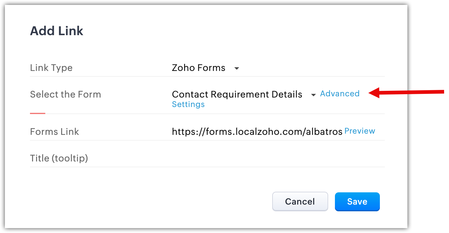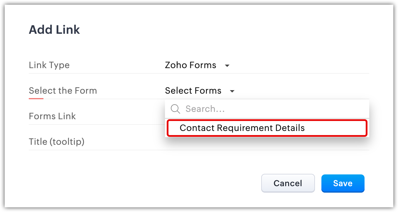 - Selectează Zoho Forms ca tip de link.