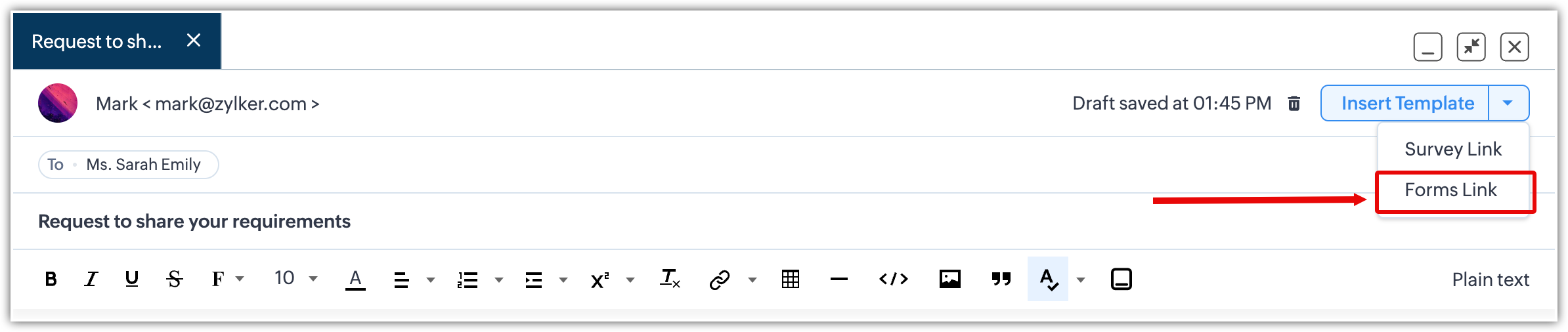 Pe de altă parte, poți adăuga direct formularul sau URL-ul acestuia în timp ce scrii un email în fereastra pop-up de trimitere email.