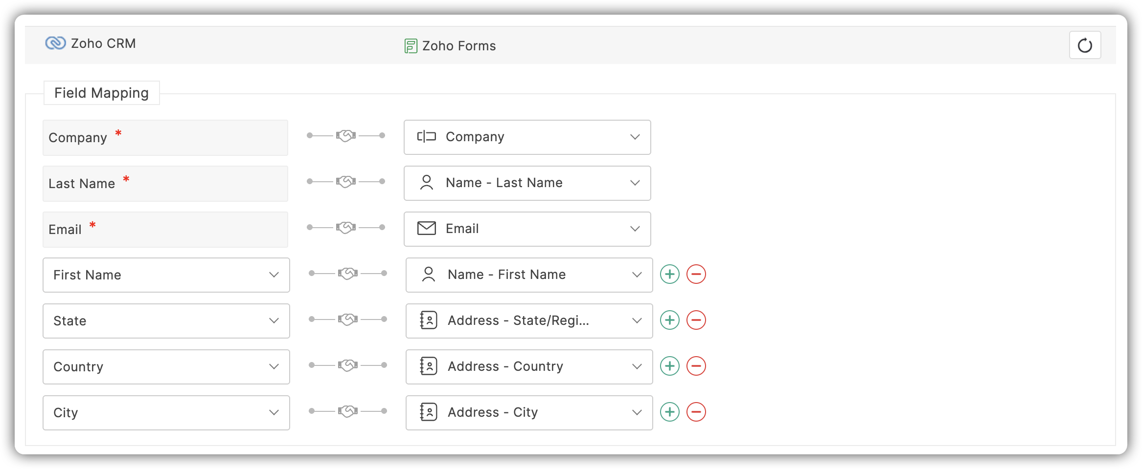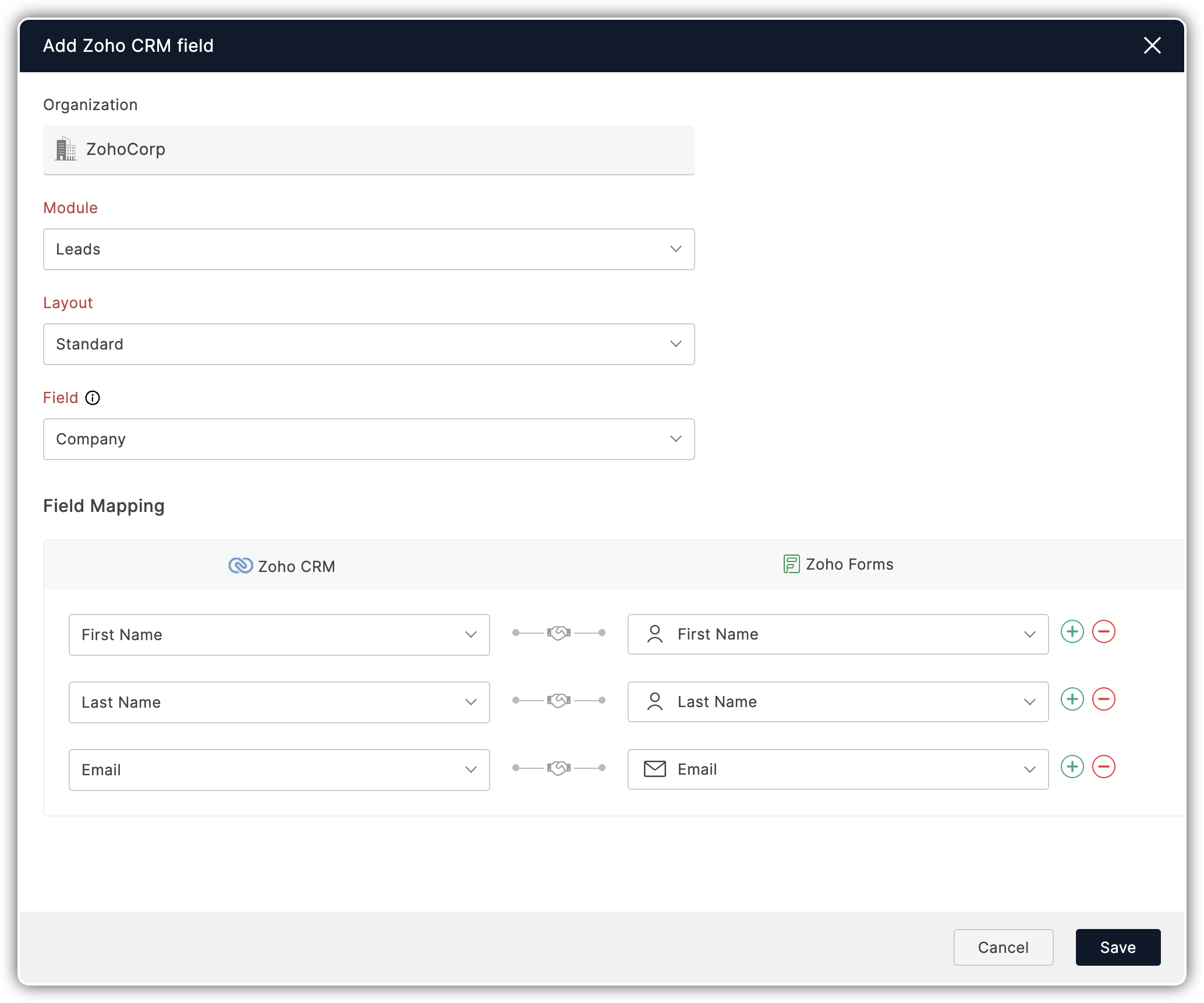 - Pentru a mapa mai multe câmpuri din Zoho CRM cu Zoho Forms, apasă butonul +Adaugă câmpuri.