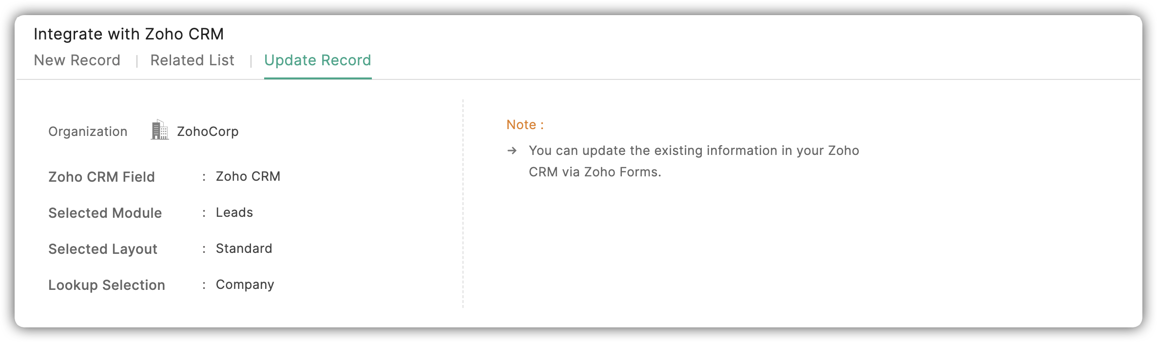 - O sincronizare bidirecțională asigură transferul de date între Zoho Forms și Zoho CRM.