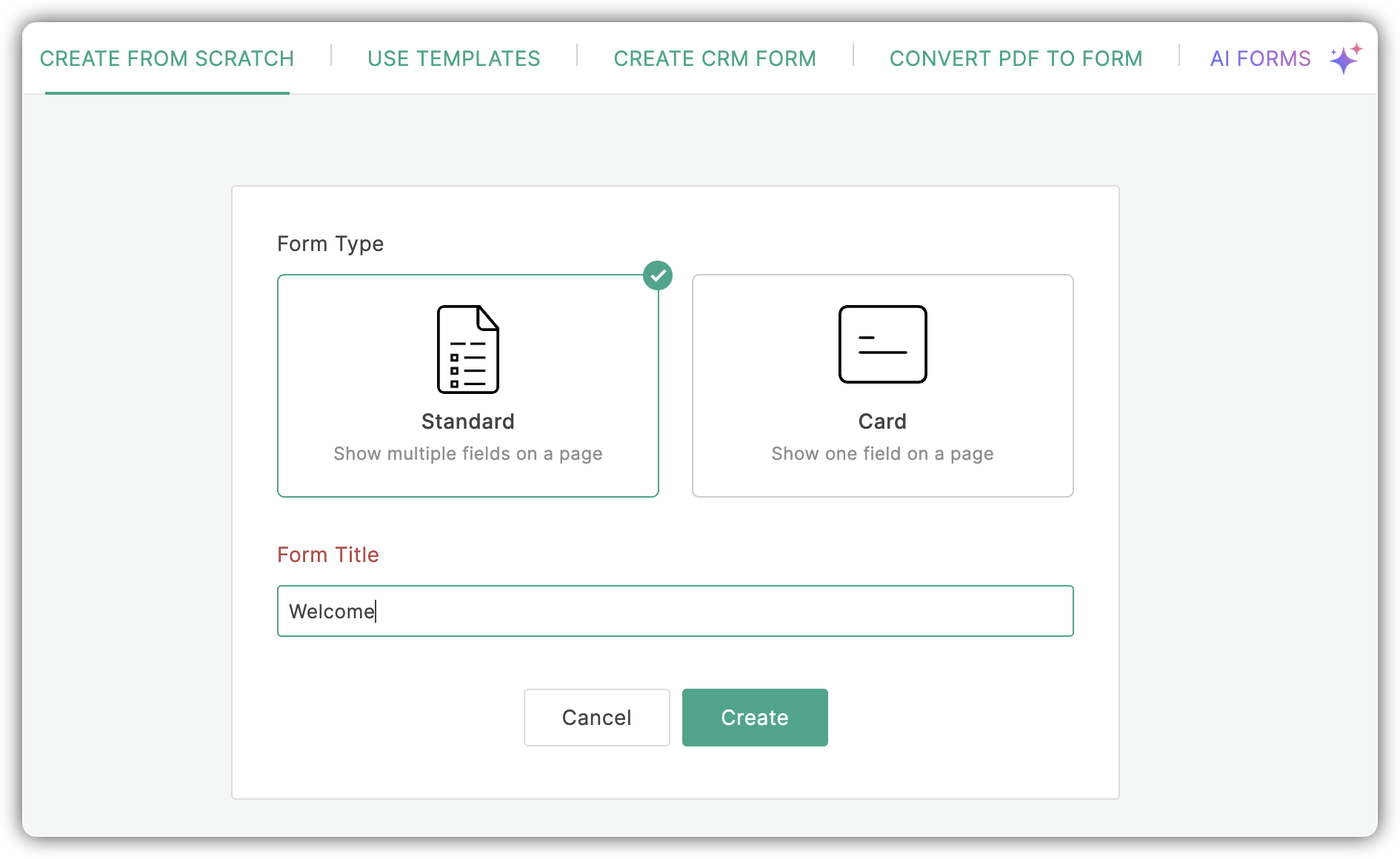 Folosind Zoho Forms poți crea un formular nou de la zero sau alege din șabloanele disponibile.