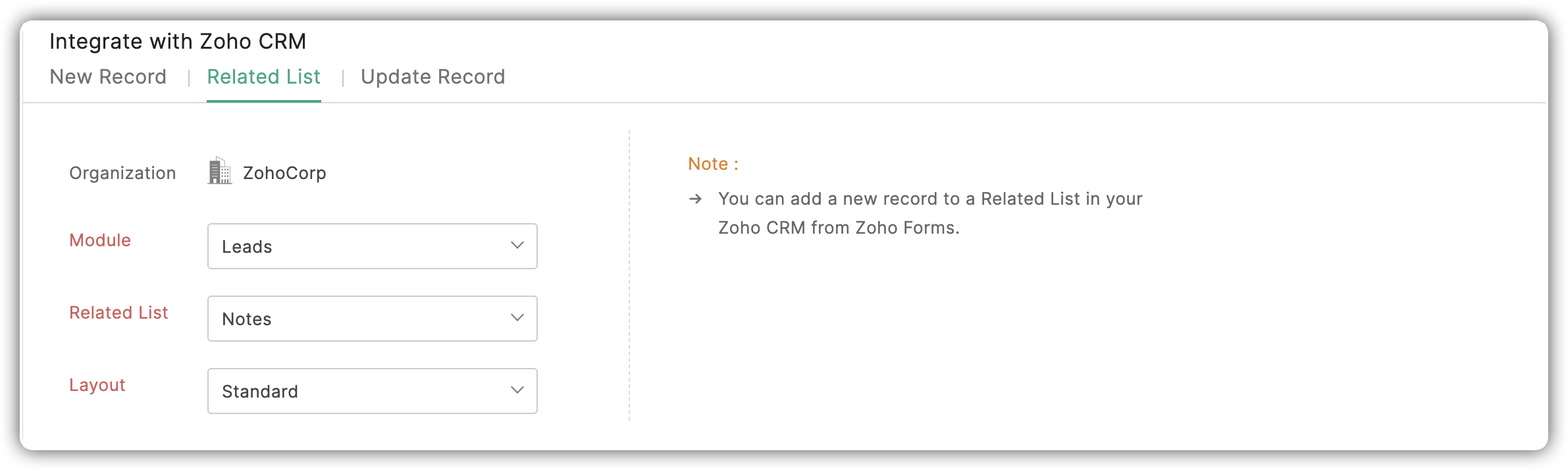 - Selectează câmpul CRM din lista derulantă. Câmpurile relevante din formular vor fi listate în lista derulantă sub Zoho Forms.