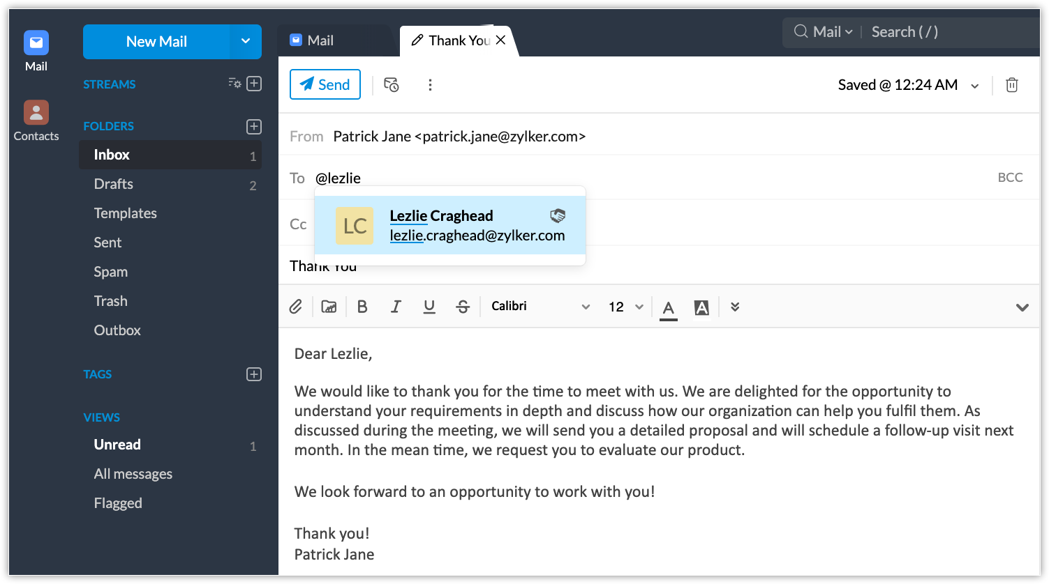 Poți de asemenea să tastezi @ urmat de numele înregistrării, pentru a trimite un email acelei înregistrări.