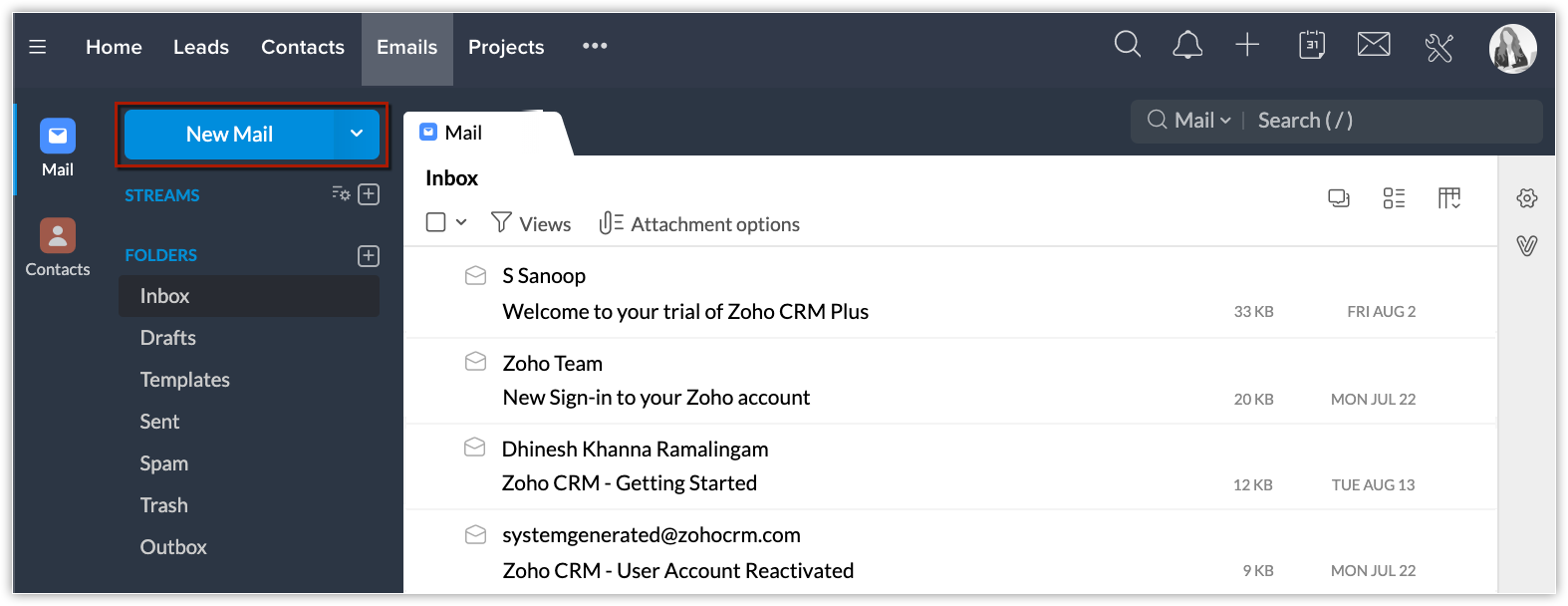 După ce ai configurat serviciile de email folosind protocolul POP3 în contul tău Zoho CRM, vei observa adăugarea unei file Email-uri. Din această filă, poți trimite cu ușurință email-uri contactelor stocate în CRM-ul tău. Aceste email-uri trimise vor fi apoi listate în secțiunea asociată Email-uri a înregistrării respective.
