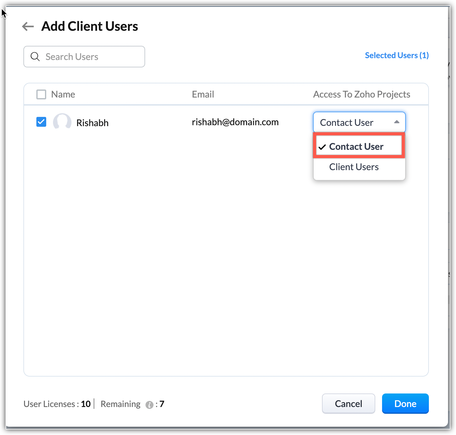 - Utilizatorii de contact sunt contactele disponibile în CRM-ul tău care pot fi adăugate ca contacte în Zoho Projects. Dacă este un contact, acesta nu va primi acces la contul Zoho Projects. Cu toate acestea, utilizatorii client au acces la proiectele asociate.