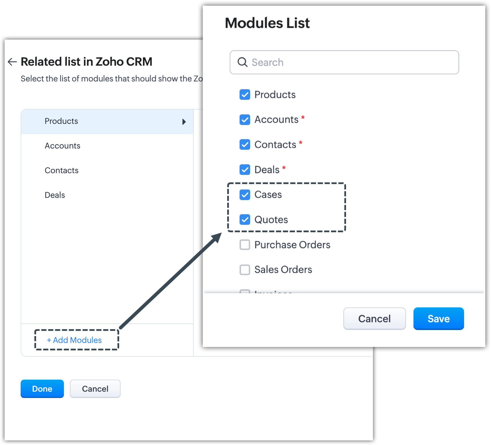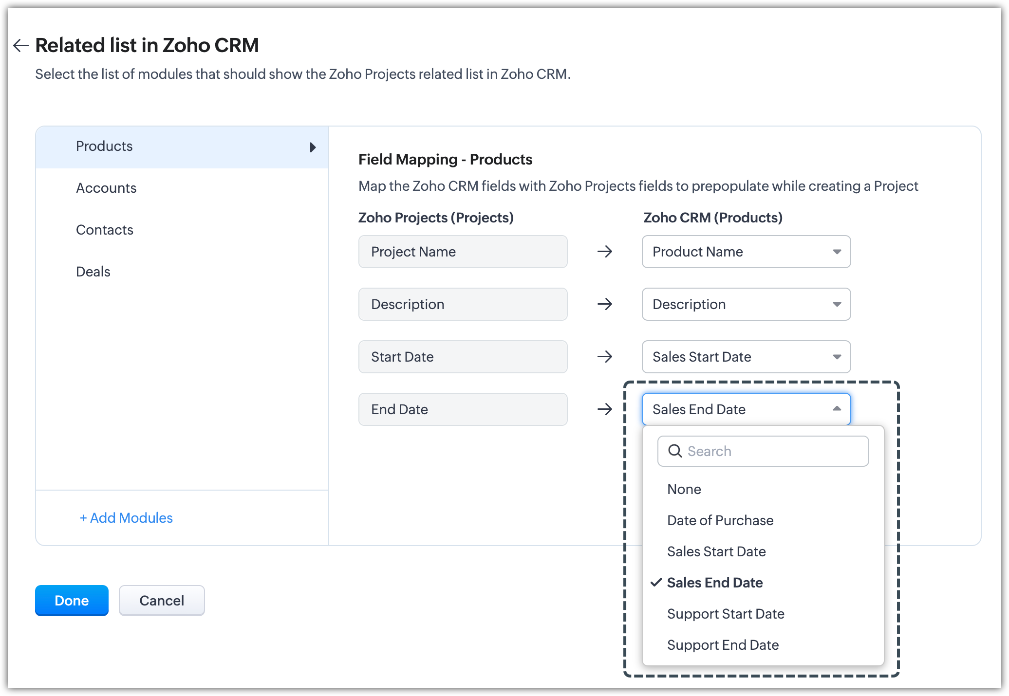 - Modulele suportate pentru configurarea listei asociate Zoho Projects în Zoho CRM sunt: Contacts, Accounts, Deals, Products, Cases, Quotes, Sales Orders, Purchase Orders, Invoices și Campaigns.