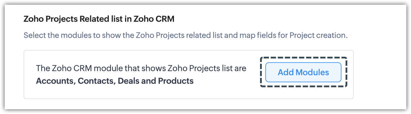 - În pagina de integrare Zoho Projects, sub secțiunea Zoho Projects related list in Zoho CRM, apasă Add Modules.