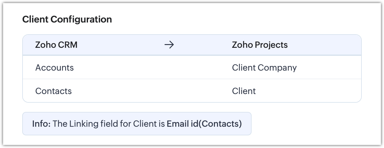 - Maparea Client-Cont implică și maparea Utilizatorilor Client (din Zoho Projects) cu Contactele (din Zoho CRM). Această mapare se realizează în fundal și nu este afișată utilizatorilor în timpul integrării.