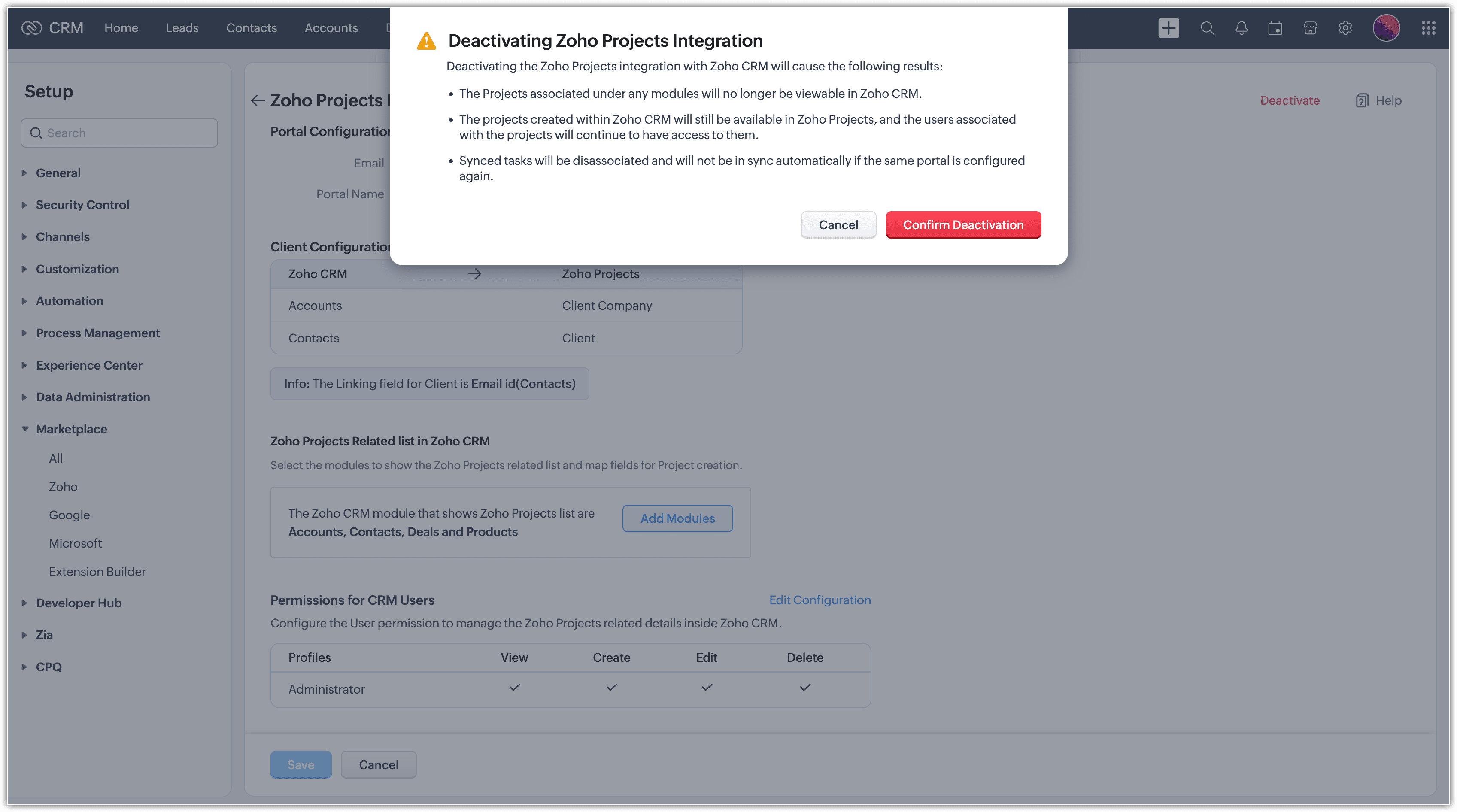- În pagina Zoho Projects, apasă Deactivate Zoho Projects.