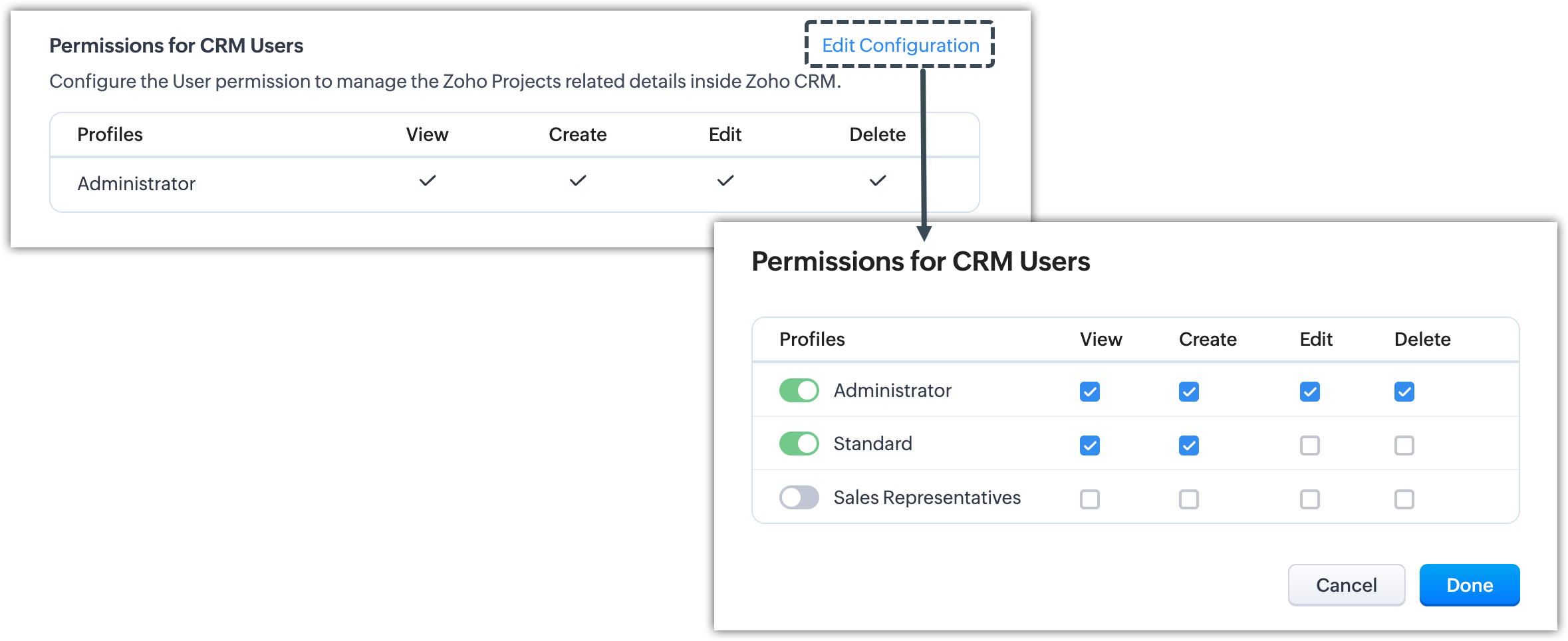 - Bifează casetele de selectare pentru profilurile respective pentru a seta permisiunile listei asociate Zoho Projects: View, Create, Edit și Delete pentru utilizatorii CRM.