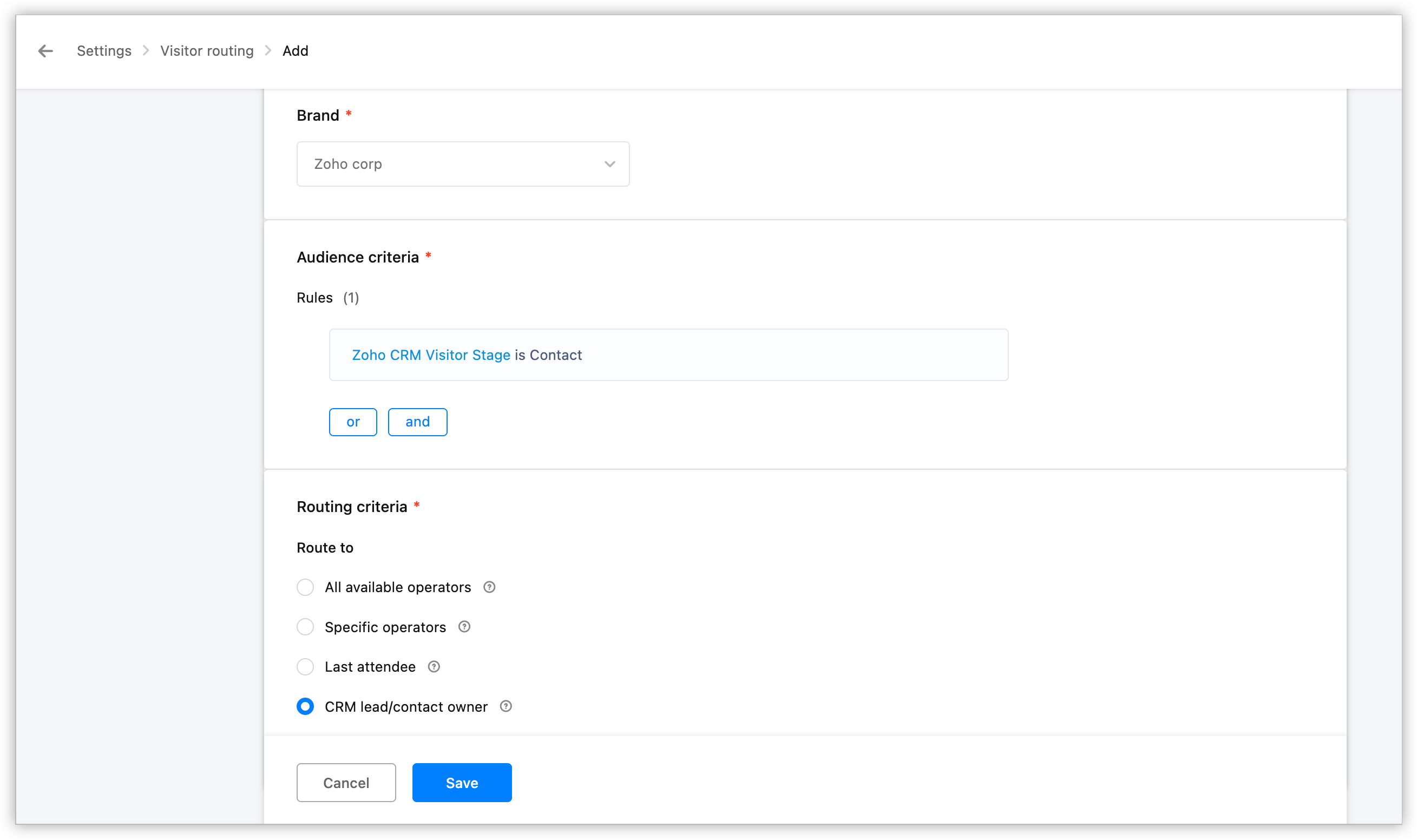 Un tab nou cu setările pentru regulile de rutare din Zoho SalesIQ va fi disponibil. - Sub Reguli de Rutare, apasă Adaugă.