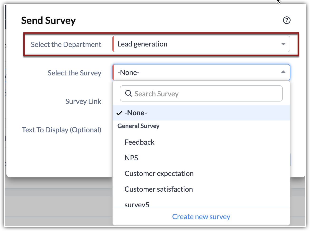 - În pagina Send Survey care apare, selectează departamentul căruia îi aparține sondajul în Zoho Survey, selectează sondajul, adaugă un text de afișat și fă clic pe butonul Insert.